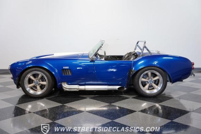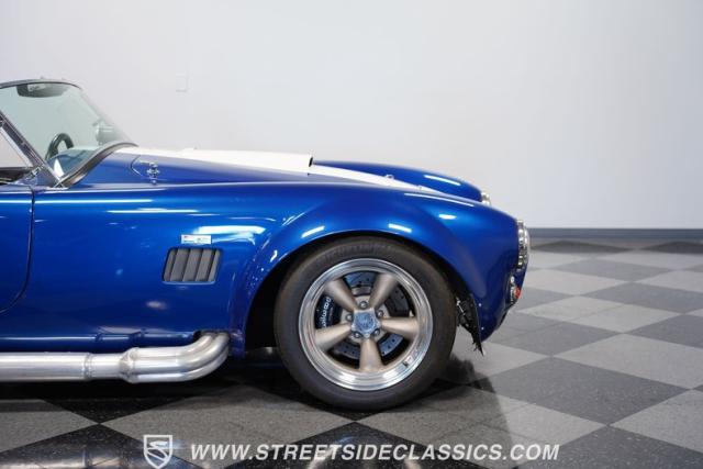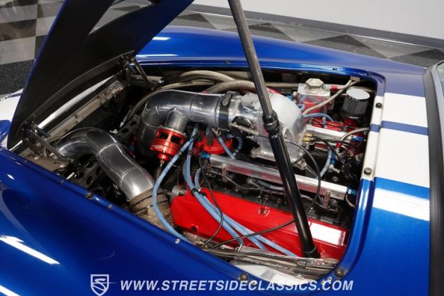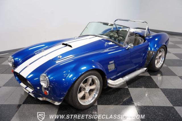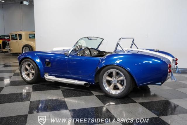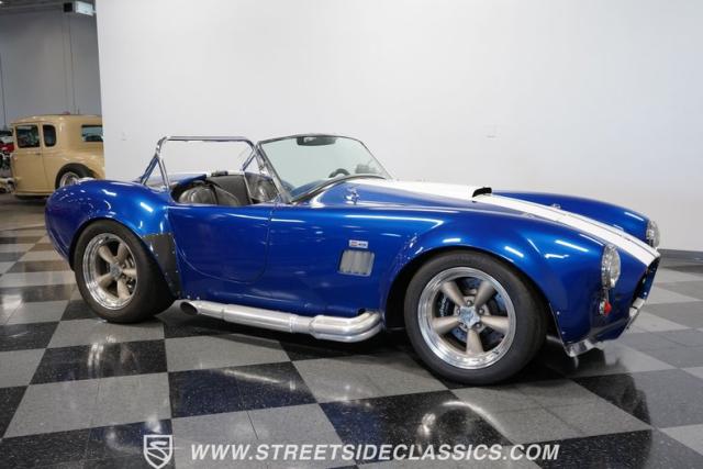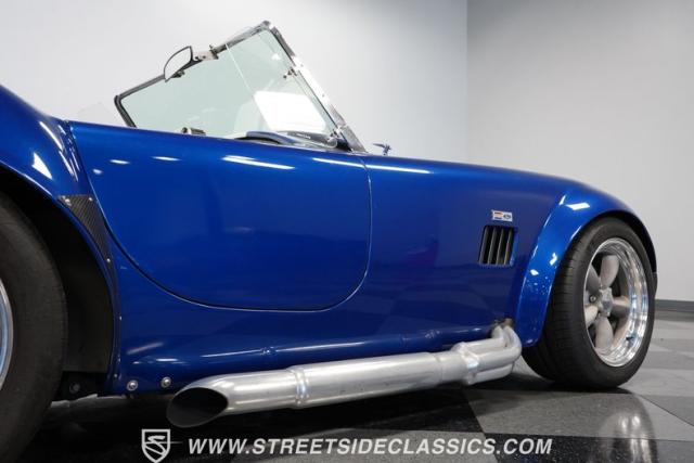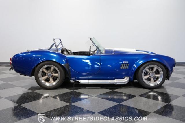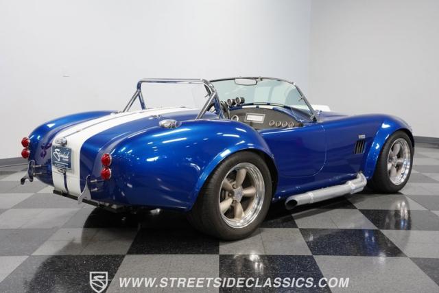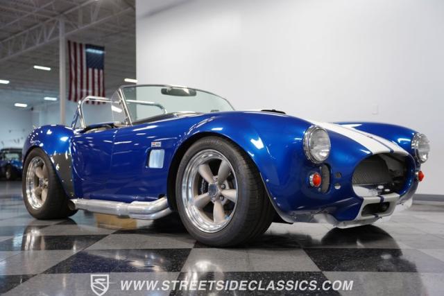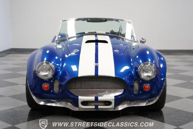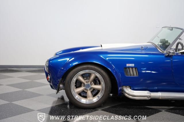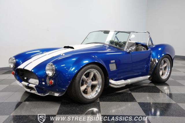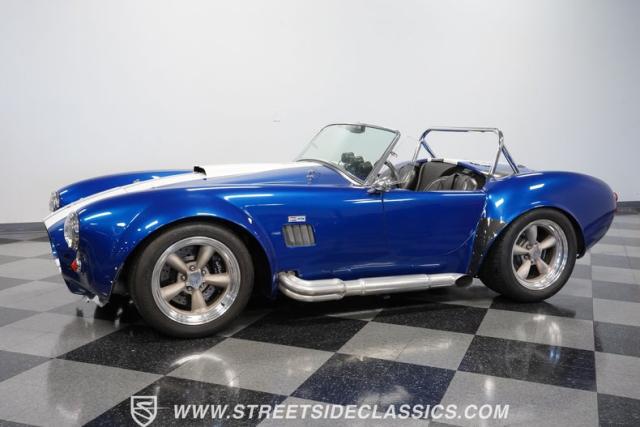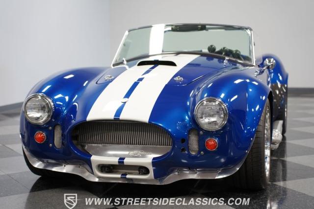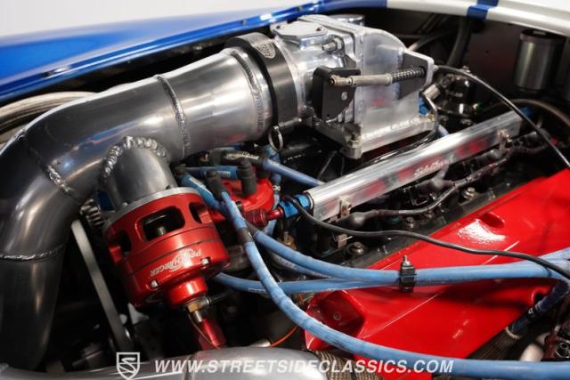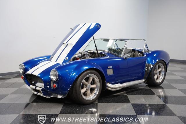 Born to conquer the track, this 1965 Shelby Cobra Factory Five Supercharged 427 is a force to be reckoned with. Drenched in a mesmerizing blue metallic paint with white stripes slicing through the air, this Cobra\'s aggressive stance clearly indicates its racing pedigree. The 17\" Torque Thrust style wheels, wrapped in 275/40ZR17 front and 335/35ZR17 rear Michelin Pilot Sport tires, provide an uncompromising grip on the asphalt. The full-length chrome rollover bar adds an extra style while highlighting the car\'s track-ready capabilities.