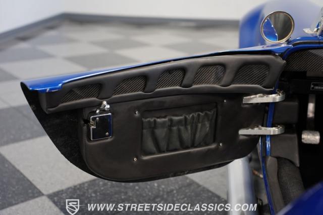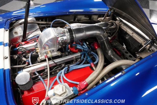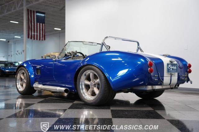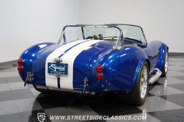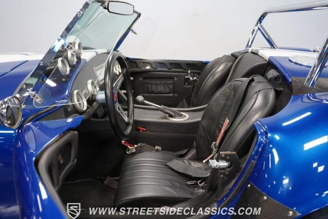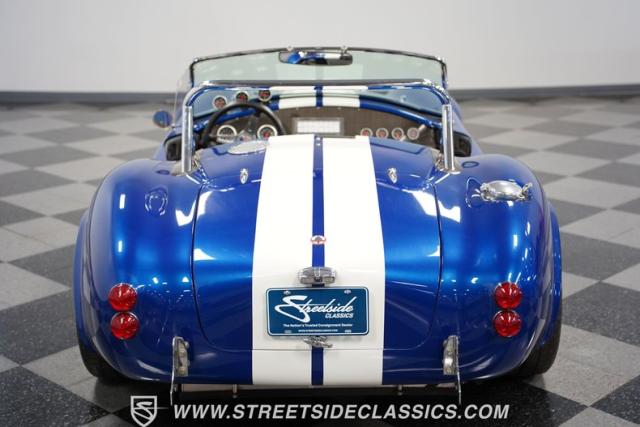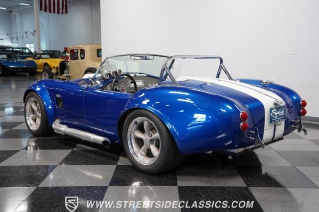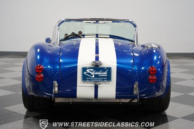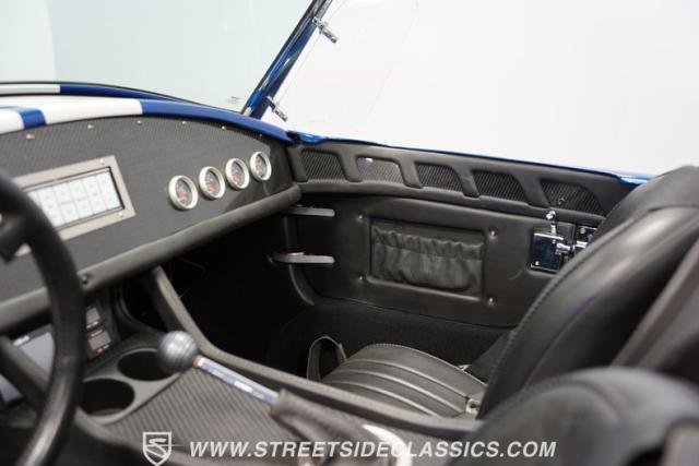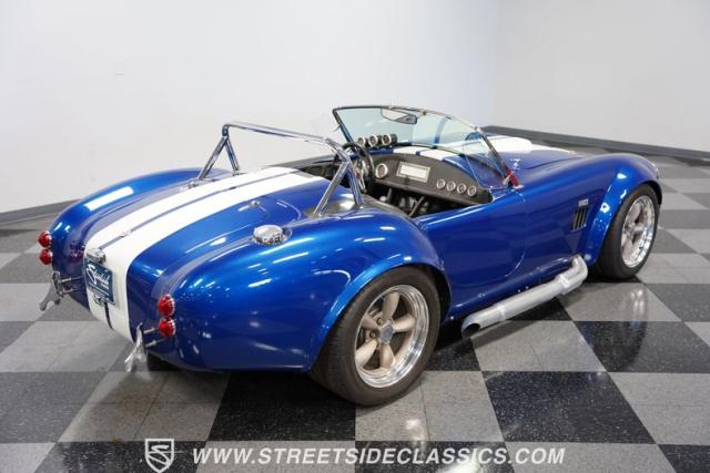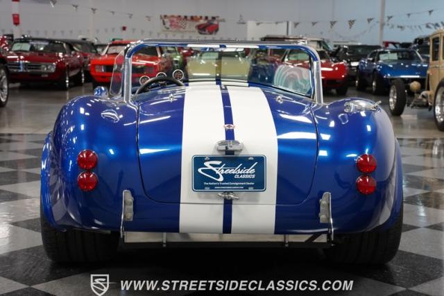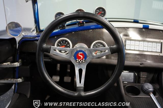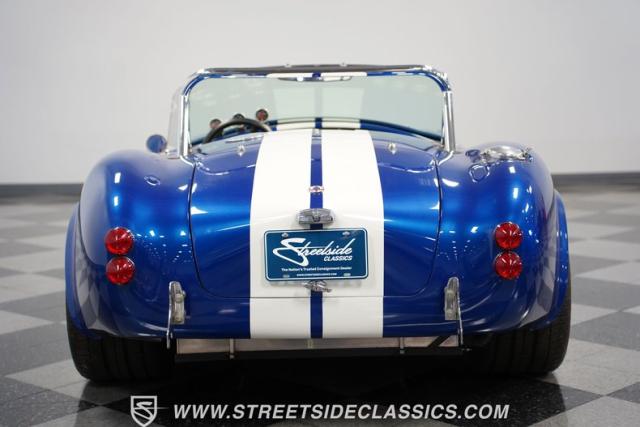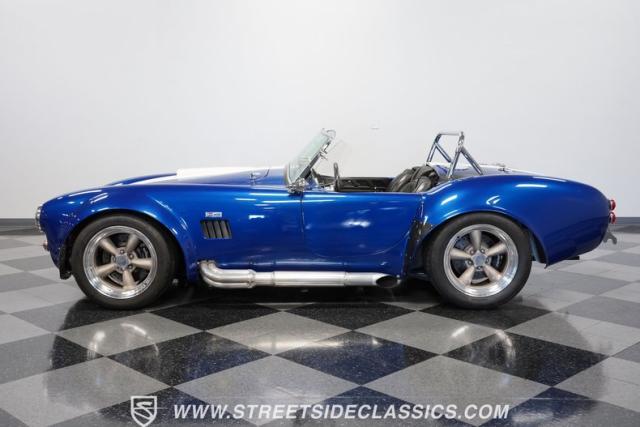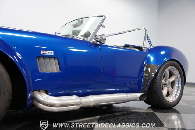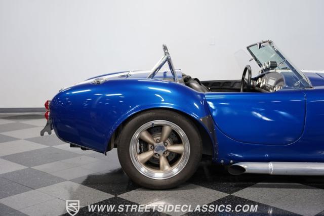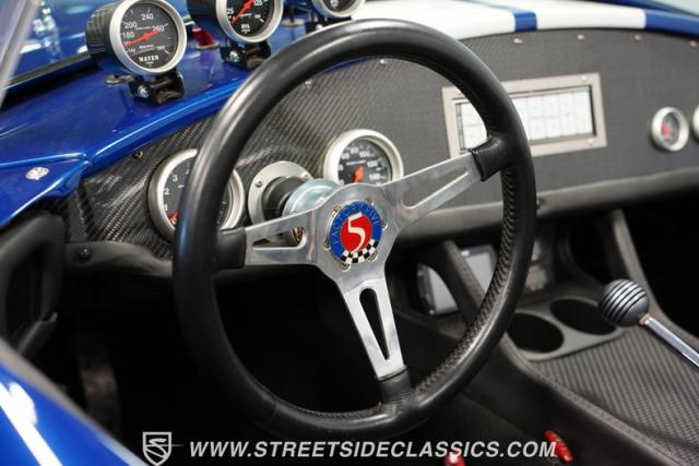 Born to conquer the track, this 1965 Shelby Cobra Factory Five Supercharged 427 is a force to be reckoned with. Drenched in a mesmerizing blue metallic paint with white stripes slicing through the air, this Cobra\'s aggressive stance clearly indicates its racing pedigree. The 17\" Torque Thrust style wheels, wrapped in 275/40ZR17 front and 335/35ZR17 rear Michelin Pilot Sport tires, provide an uncompromising grip on the asphalt. The full-length chrome rollover bar adds an extra style while highlighting the car\'s track-ready capabilities.