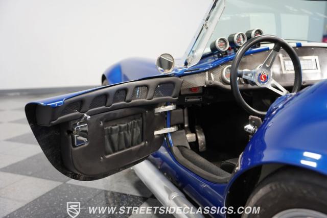 At the heart of this Cobra lies a supercharged 427ci aluminum V8, a powerhouse eager to unleash its fury on the track. Mated to a G Force T-56 6-speed transmission and equipped with a Pro Billet clutch, JE pistons, a roller cam, and a 3.27 Richmond gear, this setup is engineered for raw performance. The Procharger supercharger, paired with an oil cooler and a Griffin aluminum radiator with an electric fan, ensures optimal performance even under the most demanding conditions. The independent front suspension and adjustable coils/trailing arms in the rear, coupled with slotted/drilled 4-wheel Wilwood disc brakes and manual steering, provide precise control and stopping power.
