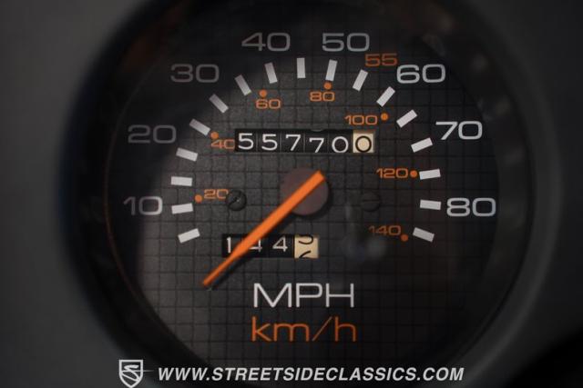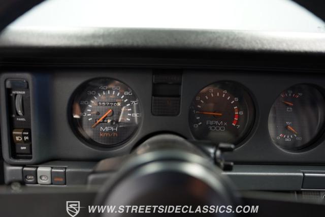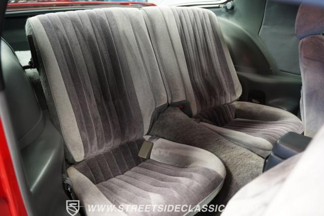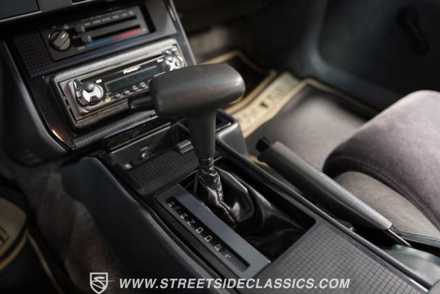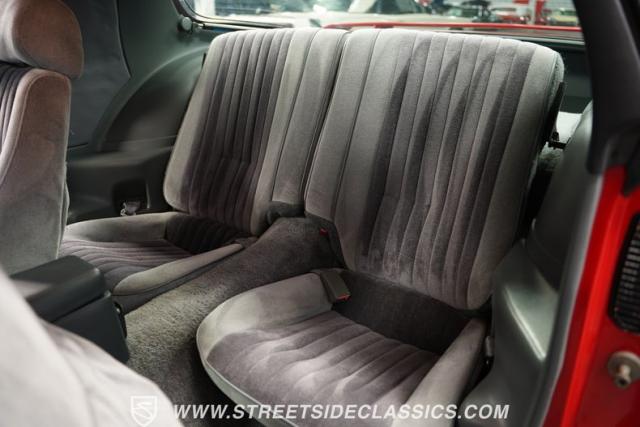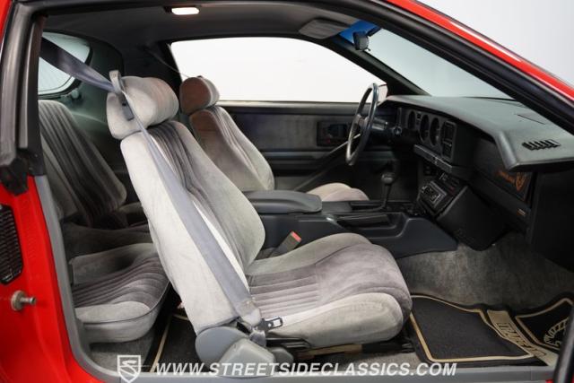 Inside this swoopy, low-slung Trans Am, the grey cloth interior appears stock-appearing, with the lone exception of its upgraded Pioneer AM/FM CD player head unit. A center console separates the front bucket seats, while a three-spoke steering wheel featuring a Firebird logo center cap sits in front of a three-pot analog dashboard gauge cluster. Fold down the rear seat backs, and this slick hatchback offers up far more cargo space than its sporty exterior might suggest.