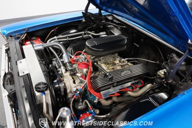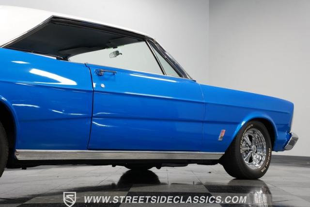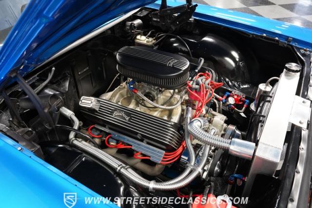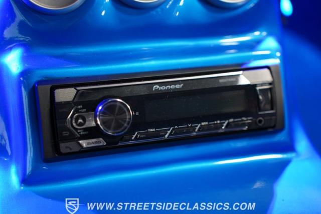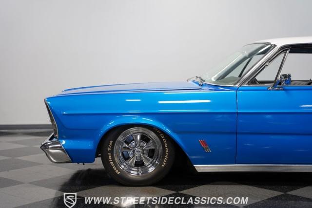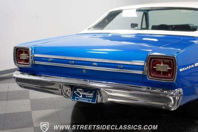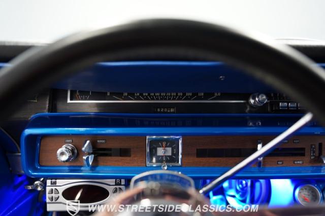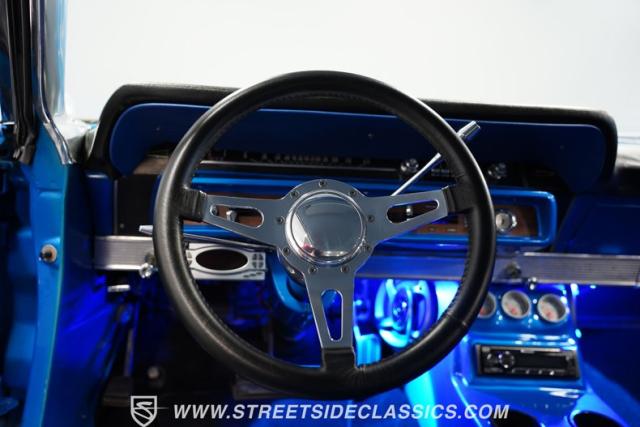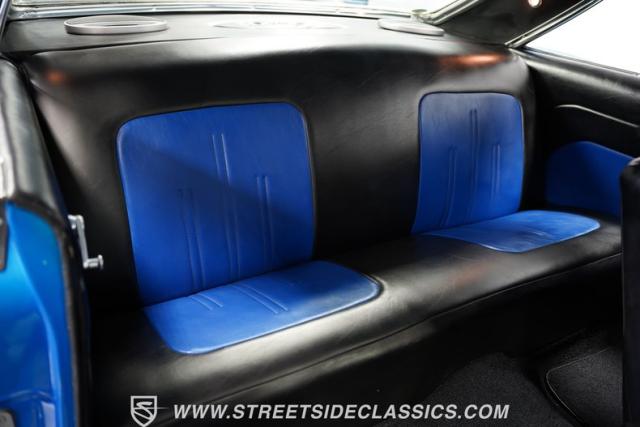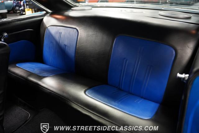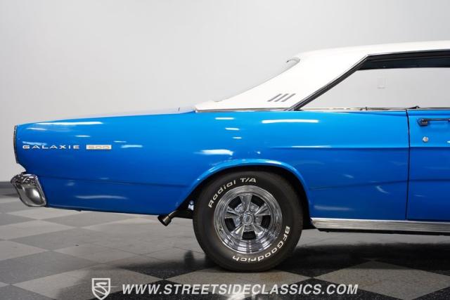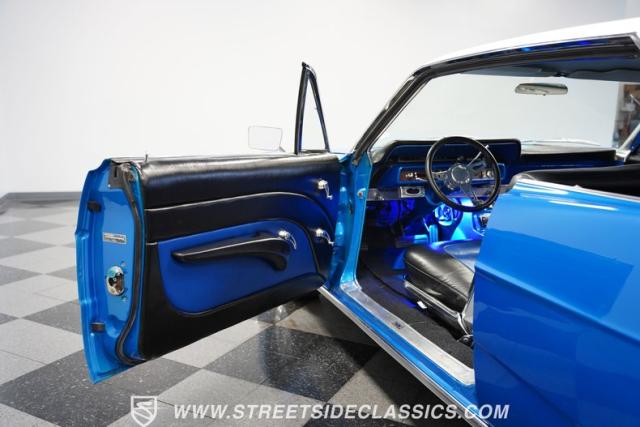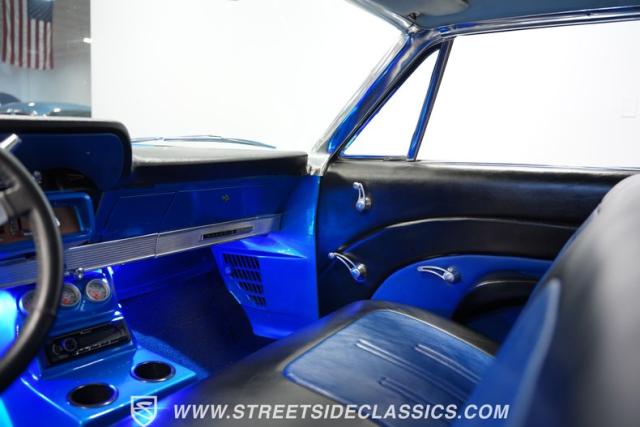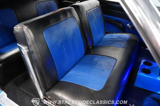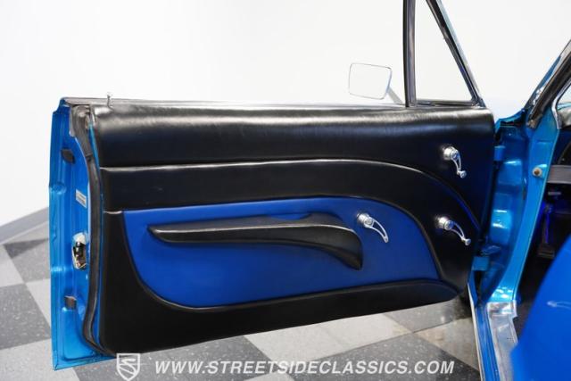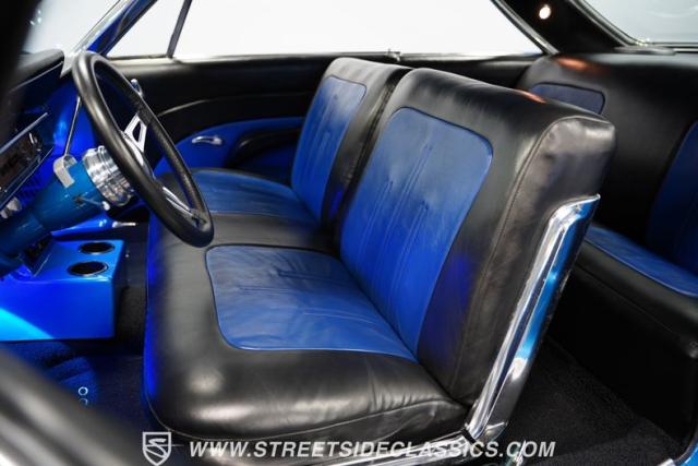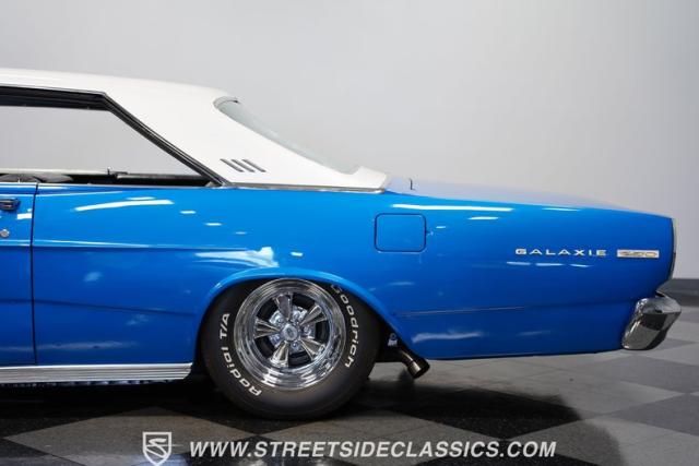 Inside, this Galaxie 500 blends classic style with modern flair. The custom black and blue interior features blue LED accent lighting, creating an atmosphere that\'s both retro and contemporary. Vinyl bench seats offer comfort for cruising, while billet window and door handles add a custom touch. The grafted speaker surrounds the cabin, and the custom center console demonstrates attention to detail in the cabin\'s design. An AM/FM CD changer with aux/USB capability provides modern audio options, complemented by an Infinity amp and Xploid subwoofer in the trunk for enhanced sound quality.