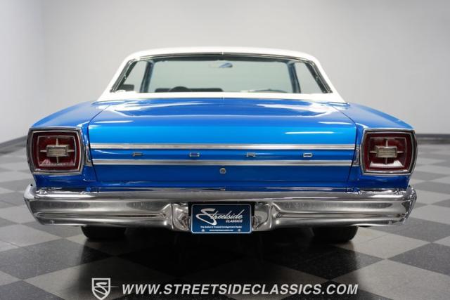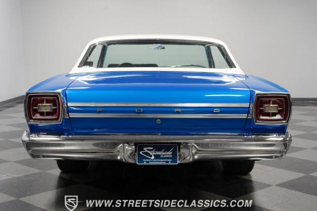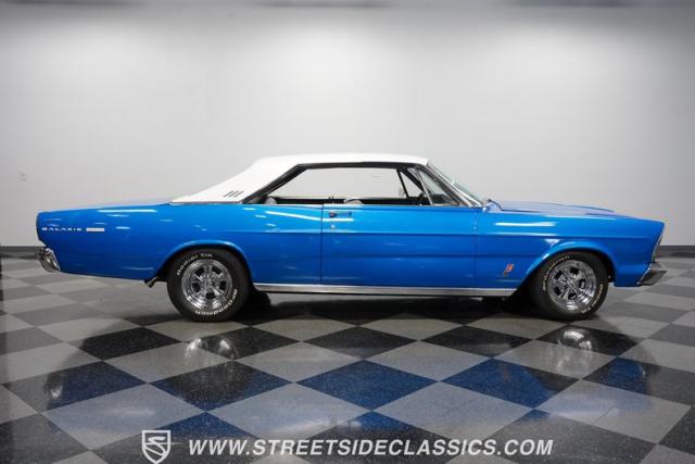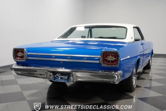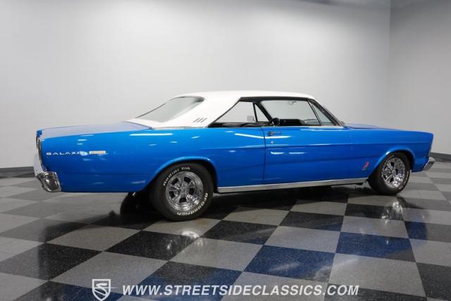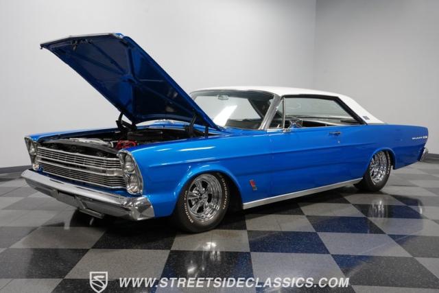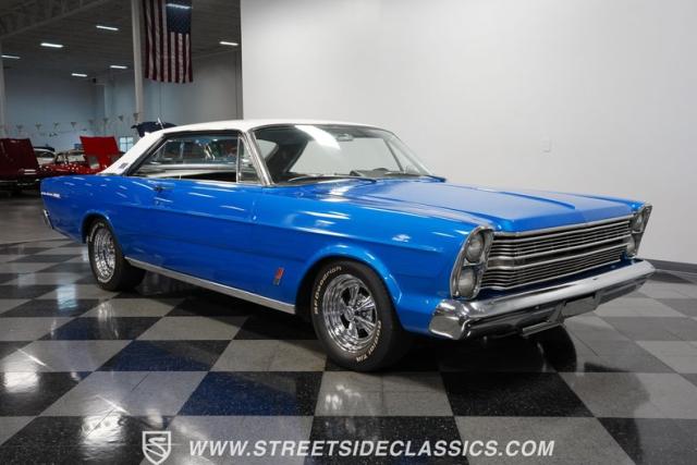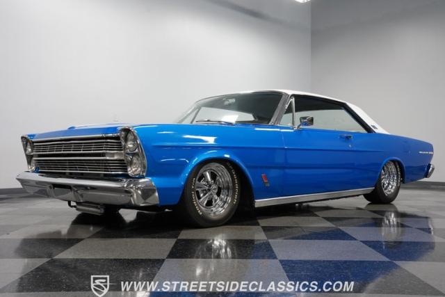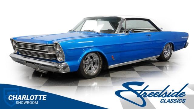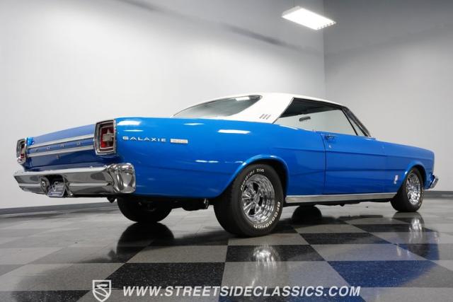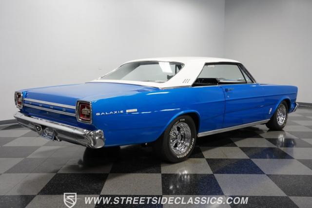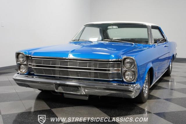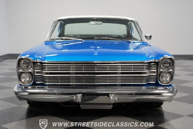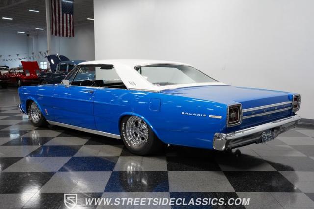 This 1966 Ford Galaxie 500 Fastback briefly appeared in Fast and Furious 9, showcasing its cinematic appeal in the warehouse scene. The metallic blue paint job, contrasted by a pearl white top, gives this classic Ford a bold, modern edge. Crager SS 15\" wheels wrapped in 225/70R15 tires on all four corners provide a muscular stance, while the chrome bumpers and trim add a touch of classic elegance. The fastback roofline flows seamlessly into the rear deck, emphasizing the car\'s aerodynamic profile and performance intentions.