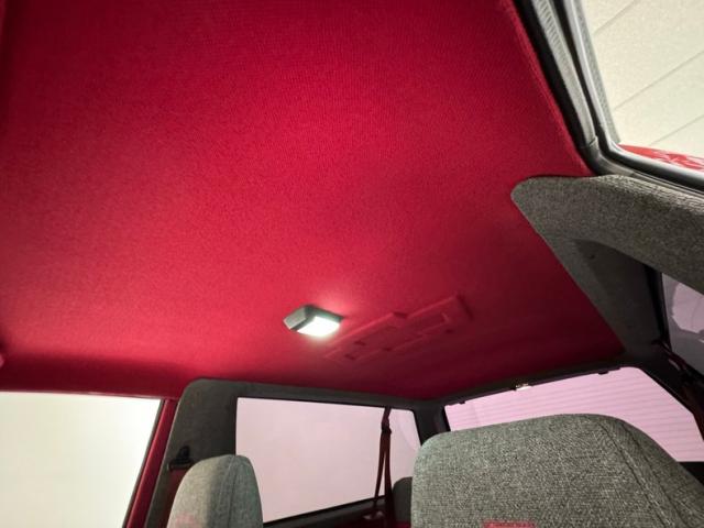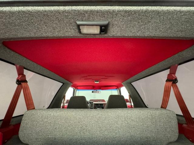 Talk about custom, this truck shouts it out with a swing of the doors and we are met with retina searing red tweed mixed with black plastic and gray tweed insert panels. These doors are definitely a party going on and we haven\'t even gotten inside as of yet! Turning our attention to the inside, which makes use of a gray tweed peppered with colored speckles and red stripe inserts to emulate the door panels. Now there is a party going on! A custom speckle gray tweed panel dash now fronts the Grant GT 3 spoke rally style steering wheel. Vintage style faux carbon fiber gauges occupy the driver\'s field of vision, and in the center of the dash are the factory heater/AC controls above the B&M shifter within a late model black plastic console. A Pioneer digital flip out AM/FM/Bluetooth radio is now inserted into the original space and is surrounded by a near perfect red dash top. For the rear, a speckle tweed gray and red rear bench is in and provides room for 2 of your friends. Side interior panels and the headliner are also the red background with the gray and black colored speckle. Now the party is really rollin\'. Last one in the pool with a suit on is a rotten egg!