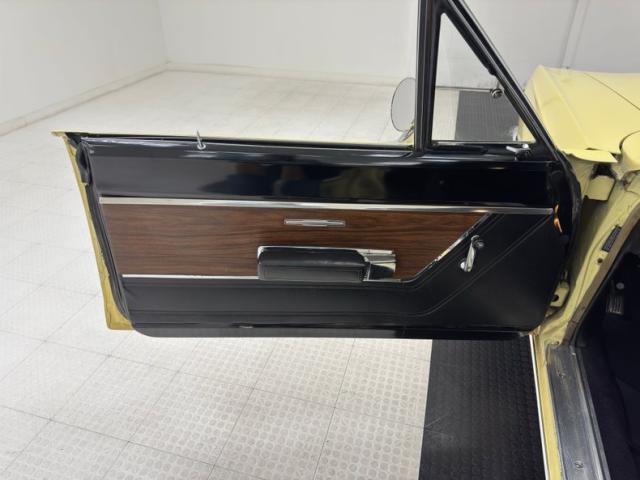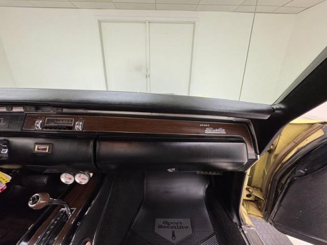 B-body greatness is enhanced by the Sunfire Yellow paint in two glossy two stage application with the black vinyl top providing a classic contrast. Beyond the doors resides a long panel and just like the front fender, contains a body line that is subtle but made more evident by the shadowing pale yellow provides. The sheer length bookends the flat decklid with a panel that is adorned with some polished trim and name plate. Fantastic tail light represent 60\'s simplicity and have always appeared muscular, underscored by a straight chrome bumper and two down turned exhaust tips. Mopar\'s predilection for simple front fascia is here too, bearing a family resemblance to other B-bodies of the time, and the dual headlights across a straight grille might have been pedestrian in \'69, looks aggressive today. 15-inch American Racing wheels are the shoes here and whatever dust they kick up is blocked by tasteful polished splash guards at each wheel opening. The paint, metalwork and other trim are in immaculate condition and we could find no exterior imperfections.