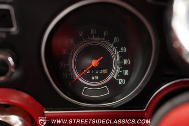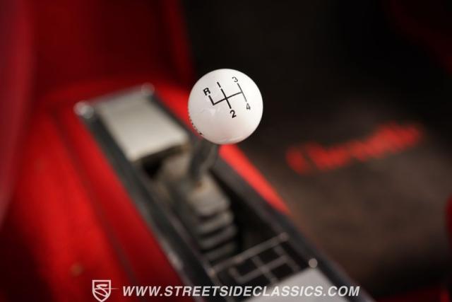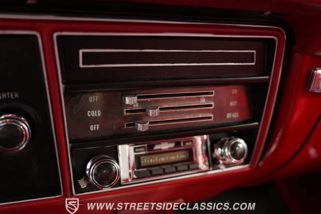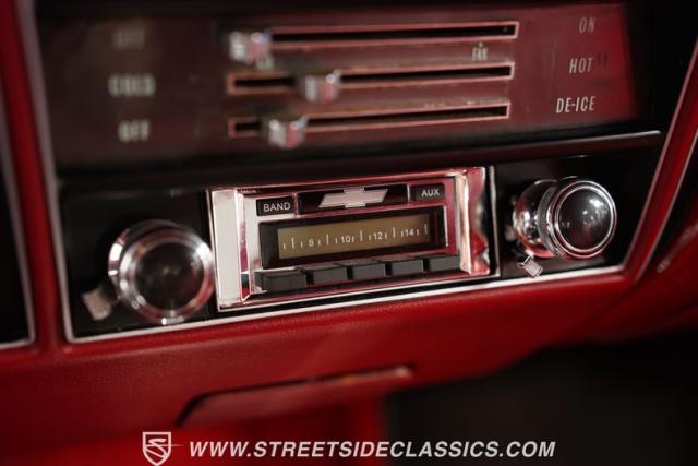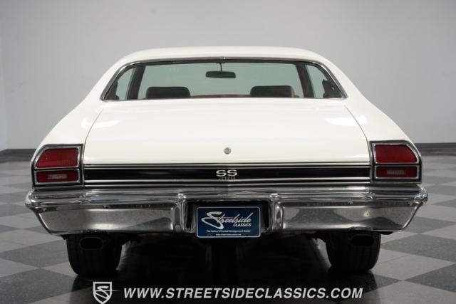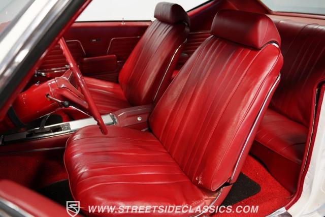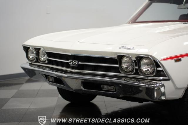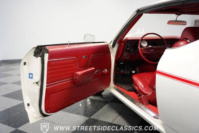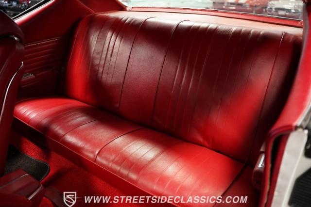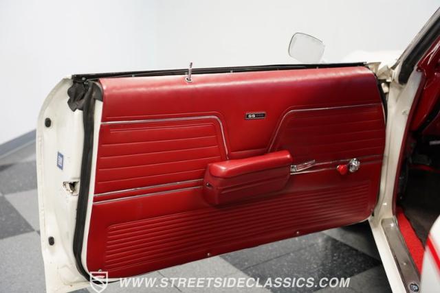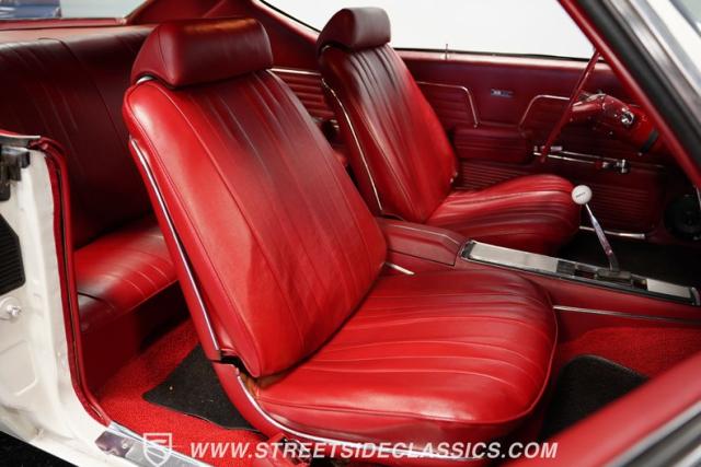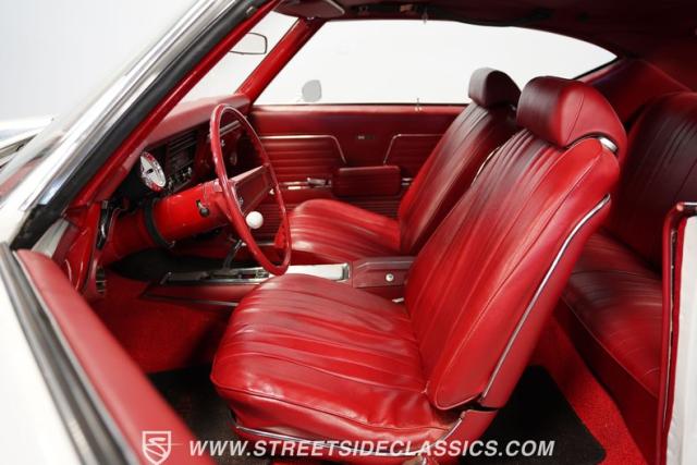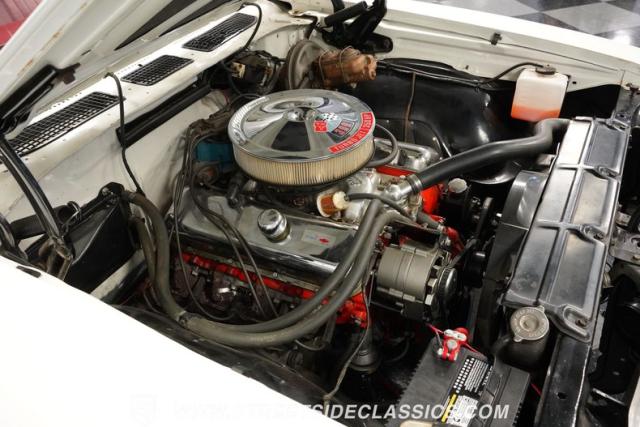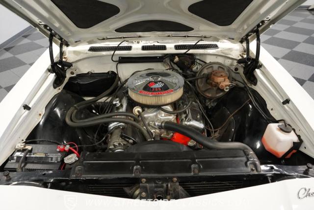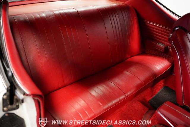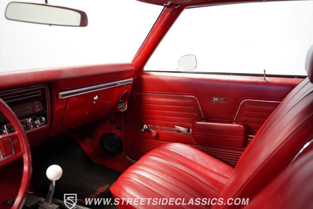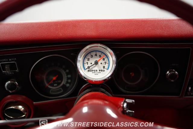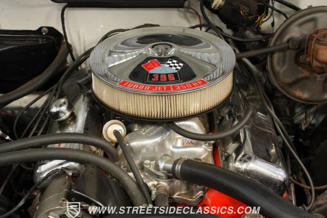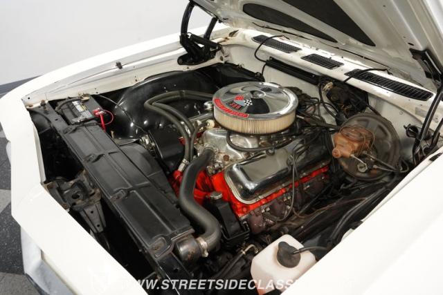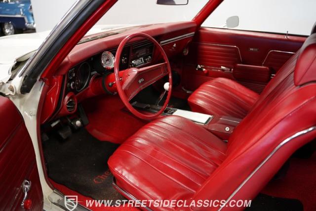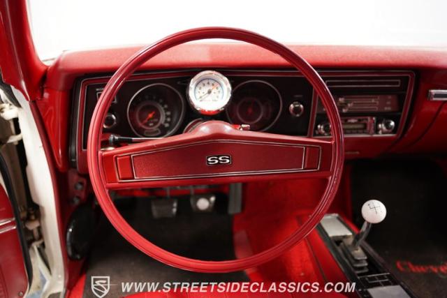 Open the door to find red vinyl bucket seats contrasting sharply with the white exterior. The Muncie 4-speed manual transmission\'s floor-mounted shifter sits ready in the center console, begging for quick shifts. An aftermarket tach bolted to the steering column keeps engine vitals in clear view. The red SS steering wheel connects you directly to this muscle car\'s soul, immersing you in pure \'60s performance.