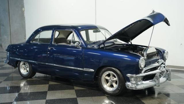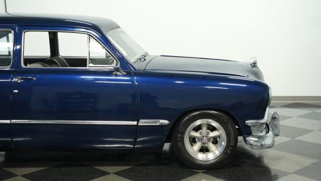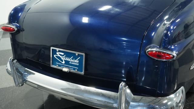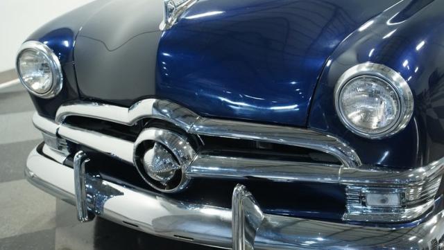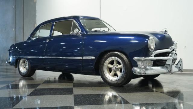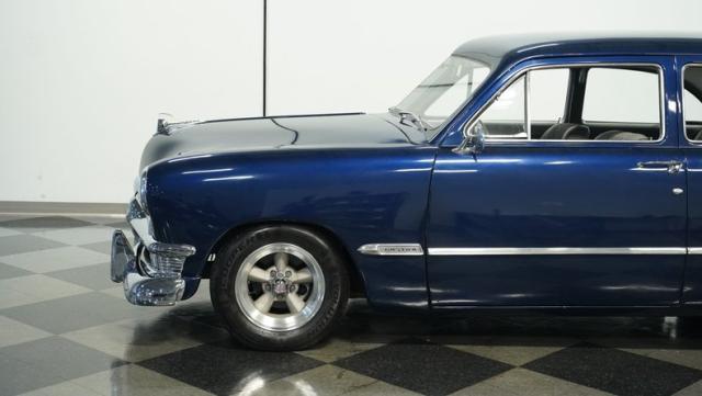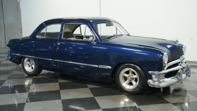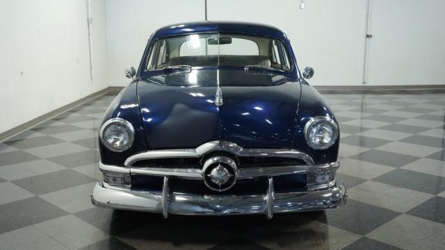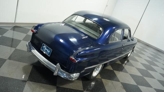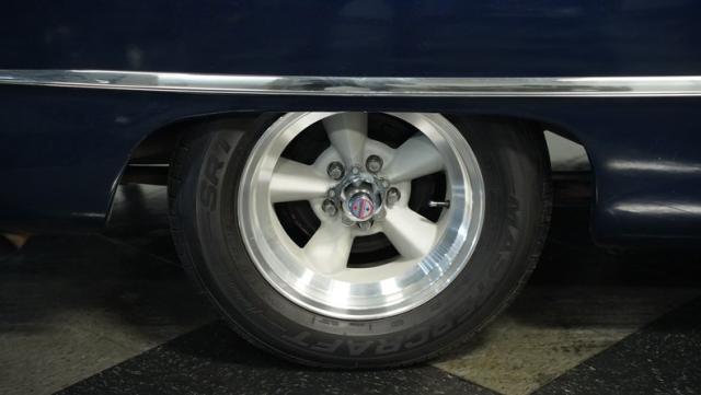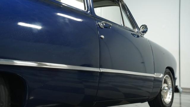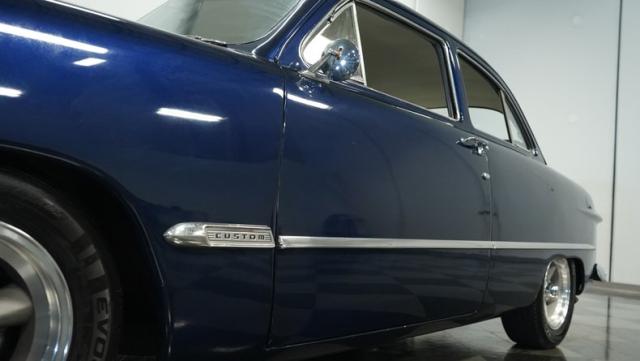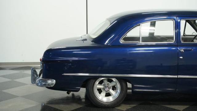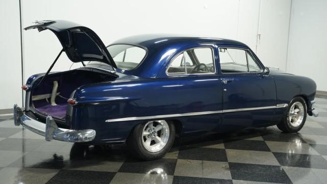 This 1950 Ford Custom with a sleek, navy blue exterior that exudes timeless elegance. The metallic blue paint shimmers under the light, complemented by clean lines and a low, aggressive stance that speaks to its classic heritage. Equipped with 15-inch American Racing wheels wrapped in 215/65R15 Cooper tires, this Ford Custom not only looks stunning but grips the road with confidence. The chrome accents and clean glass give it a polished look, while the dual exhaust hints at the power lying within. The trunk and hood release mechanisms are thoughtfully placed for easy access, adding a touch of modern convenience to this classic beauty.