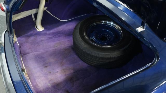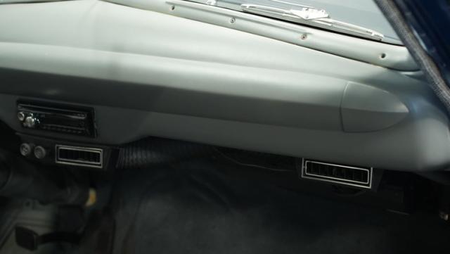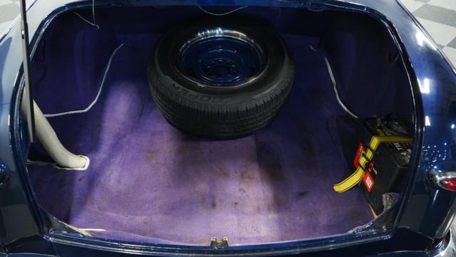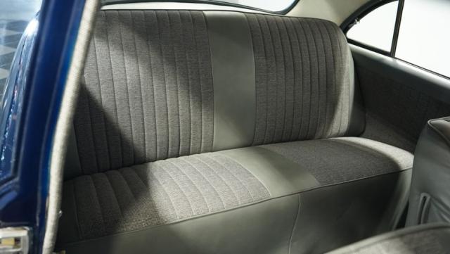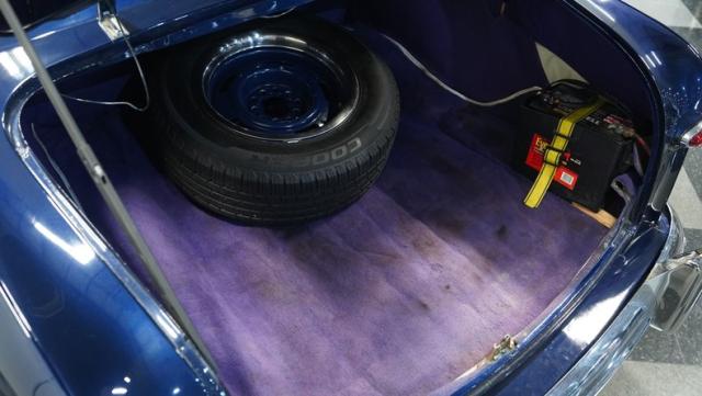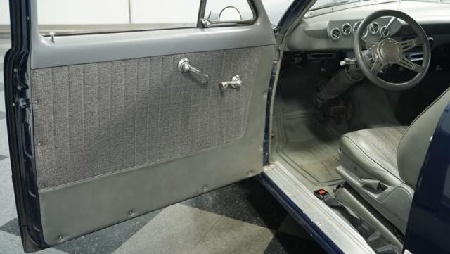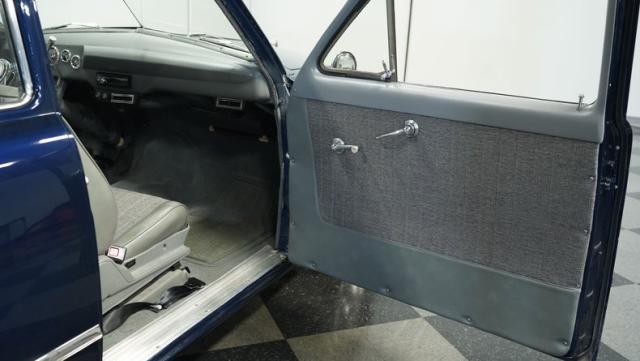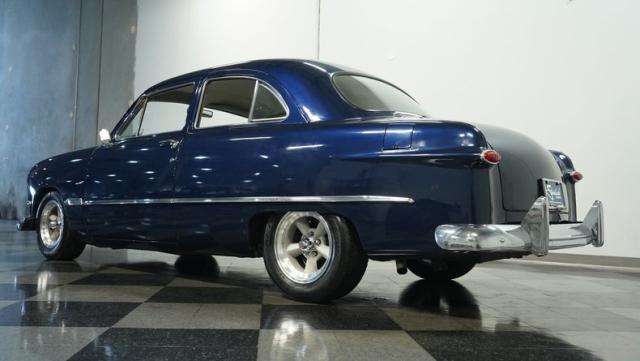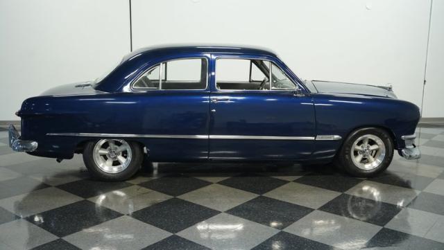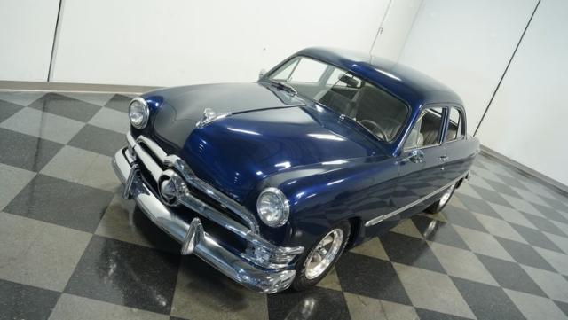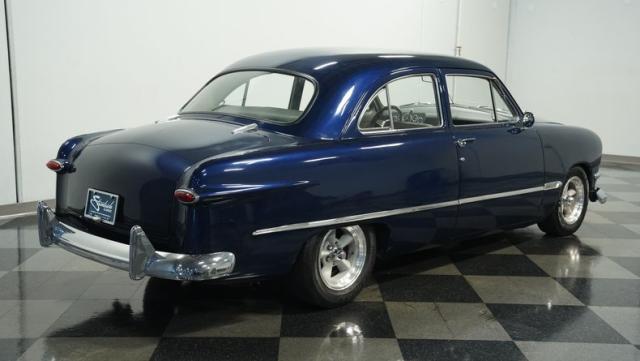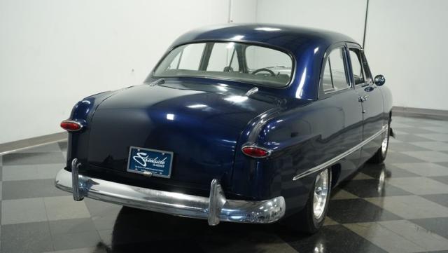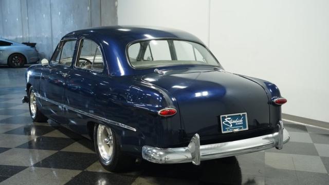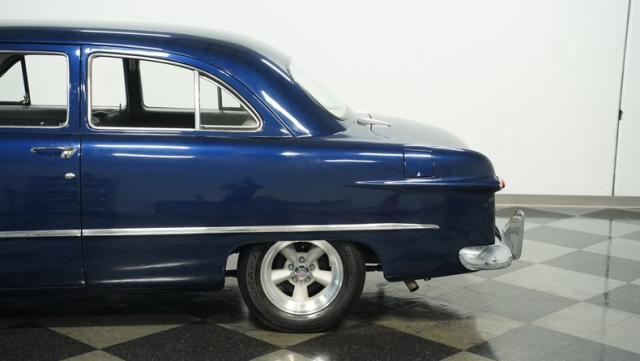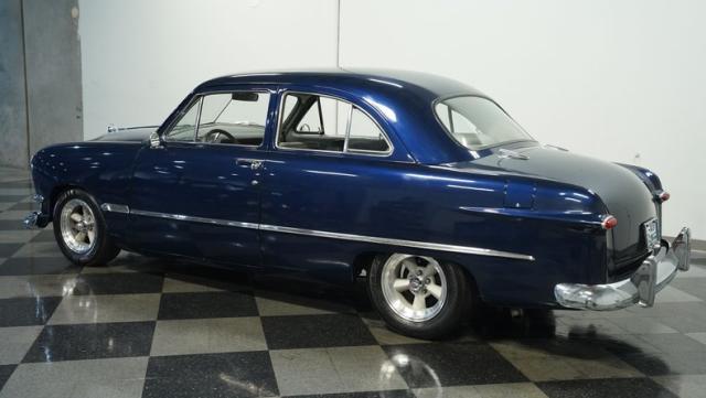 This 1950 Ford Custom with a sleek, navy blue exterior that exudes timeless elegance. The metallic blue paint shimmers under the light, complemented by clean lines and a low, aggressive stance that speaks to its classic heritage. Equipped with 15-inch American Racing wheels wrapped in 215/65R15 Cooper tires, this Ford Custom not only looks stunning but grips the road with confidence. The chrome accents and clean glass give it a polished look, while the dual exhaust hints at the power lying within. The trunk and hood release mechanisms are thoughtfully placed for easy access, adding a touch of modern convenience to this classic beauty.