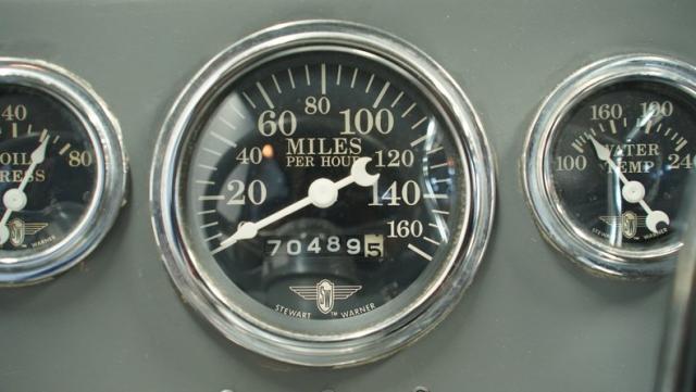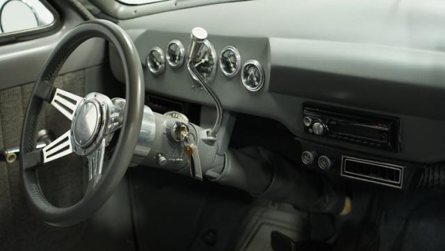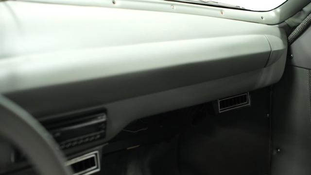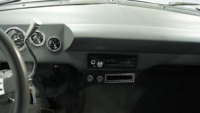 Inside, the Ford Custom boasts a stylish gray interior that blends vinyl and cloth for a comfortable and durable seating experience. The bucket seats provide ample support, while the matching two-tone upholstery extends a cohesive design throughout the cabin. An aftermarket AM/FM single CD stereo with auxiliary input ensures your favorite tunes accompany every drive. The GM tilt column and Stewart Warner gauges are neatly integrated into the dash, offering both functionality and a touch of flair. With air conditioning to keep you cool and a column shifter for smooth gear changes, the interior is designed for both comfort and ease of use.