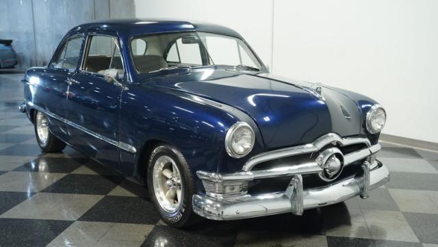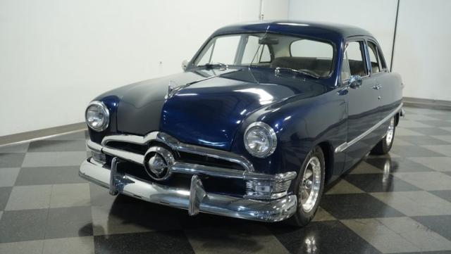 This 1950 Ford Custom combines classic style with modern performance, featuring a powerful 350 V8 engine, a comfortable gray interior, and a striking navy blue exterior. It\'s ready to hit the road with style and confidence. Call today!