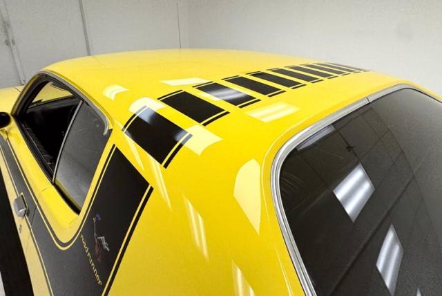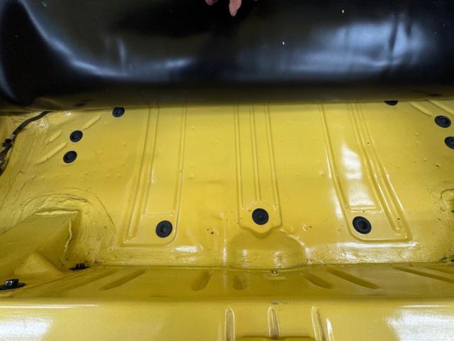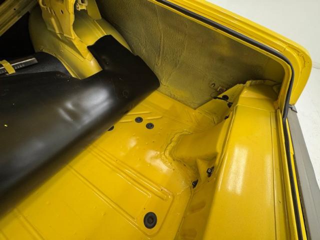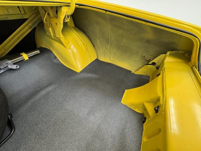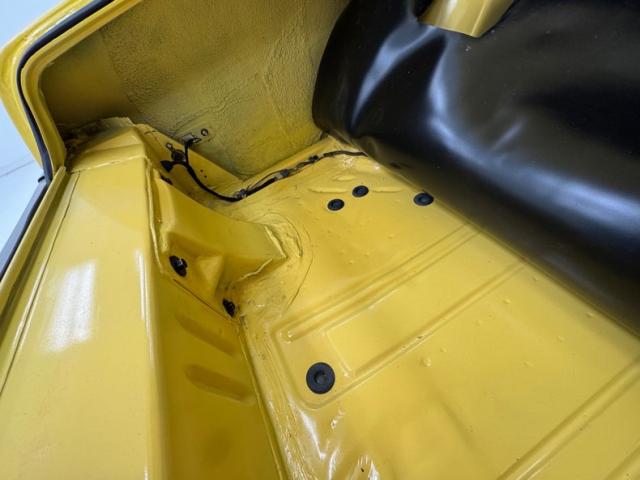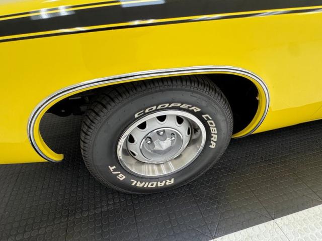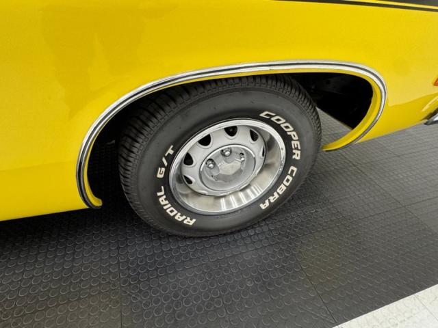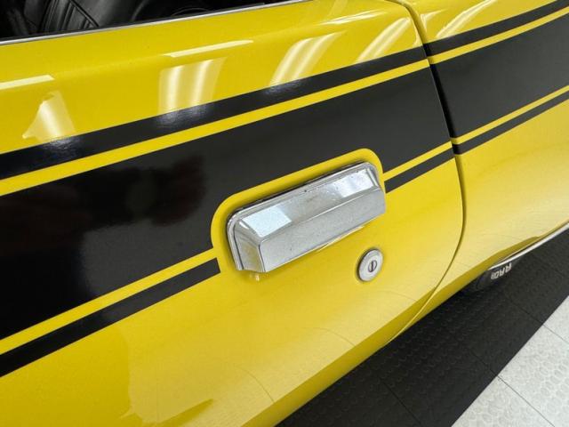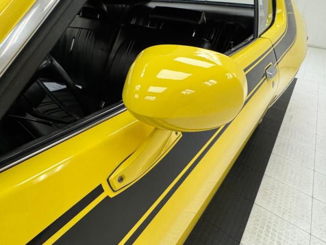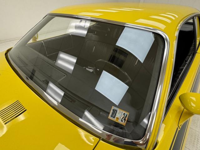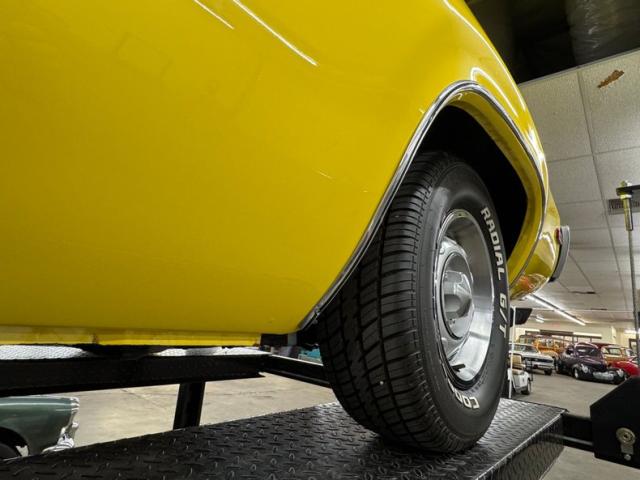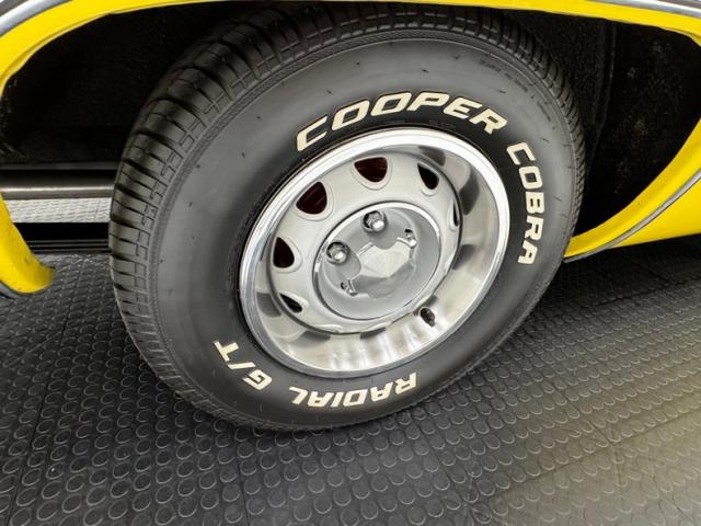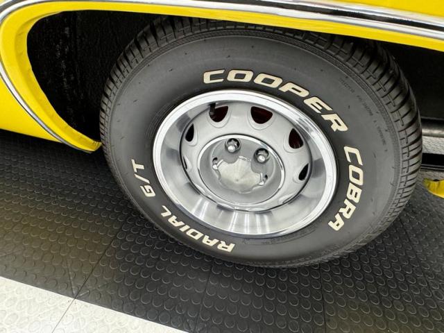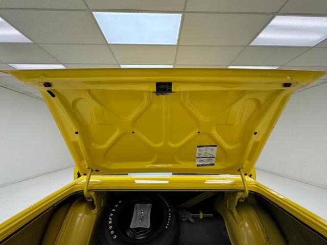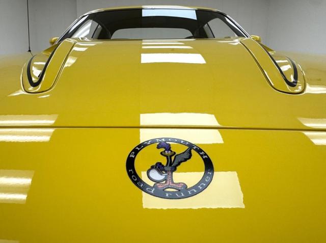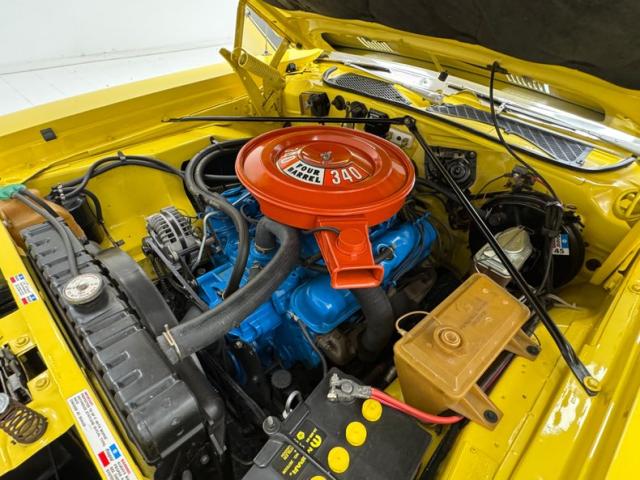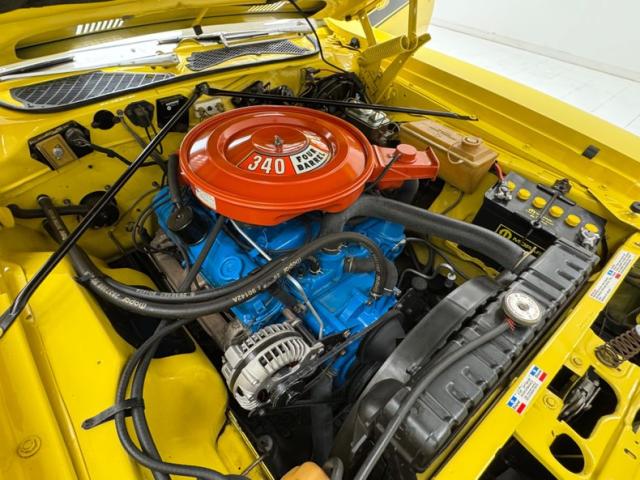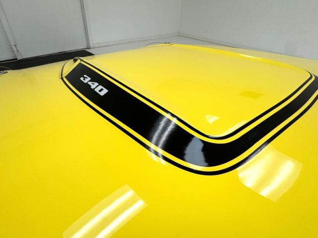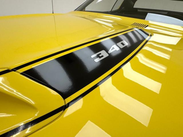 This well optioned car came with FY1 paint, Lemon Twist, now in two stage form and retaining Plymouth\'s whimsical paint naming pedigree. But it\'s the aggressive black stripe package that sets this car apart, riding the roof like a segmented basket handle and wrapping the power bulge, serving as background to highlight the 340 call outs and emerging from modified Naca-like faux ducts on the hood. In profile, chrome bumpers provide the bookends with modest wrap arounds and Mopar Rallye wheels feature letters out 225/70R14 tires with a mid 2020 date code. The pride of Warner Brothers, the cartoon bird, makes an appearance in decal form on the decklid and the nose, looking as cocky and crisp as ever. Overall, paint, body, and trim are great. Imperfections include some bubbling down low and a paint run.
