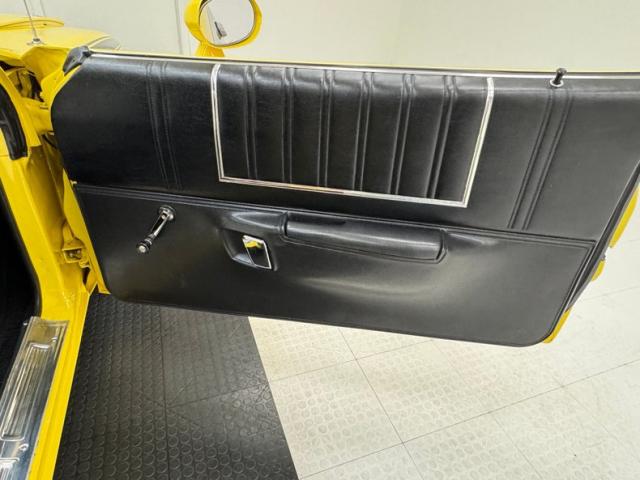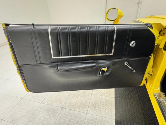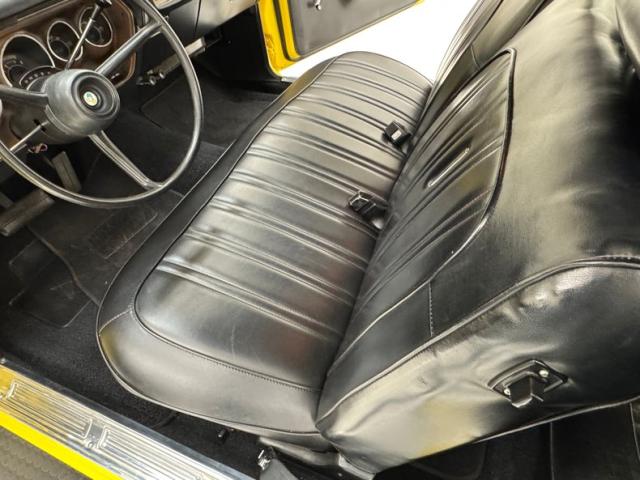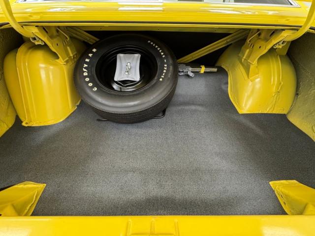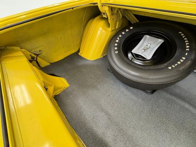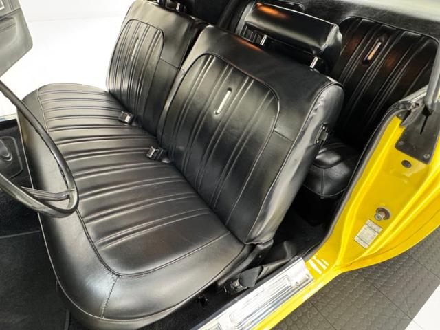 Carrying the black of the stripes to the inside, here we have handsome vinyl clad doors with minimal decorative trim and both present cleanly, leading you to the inside to find a very nice split bench seat and a bench out back and both are in great shape. No frills by today\'s standards, the classic muscle car has a simple three spoke steering wheel leading to the simulated wood faced instrument cluster taking in your basic gauges and an AM radio. The column shift leaves the floor open where black carpet provides cover, all under a clean headliner with attached shoulder belts, and use was optional at the time! A gray vinyl mat covers a nicely painted trunk floor.