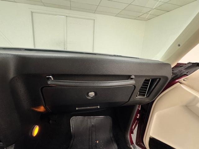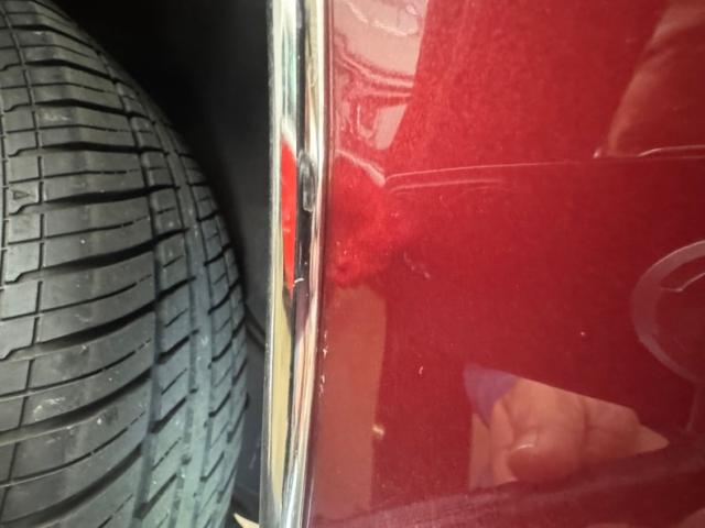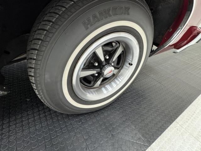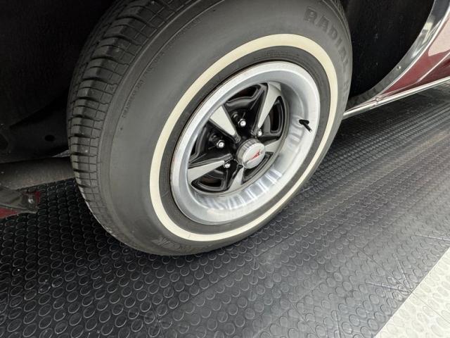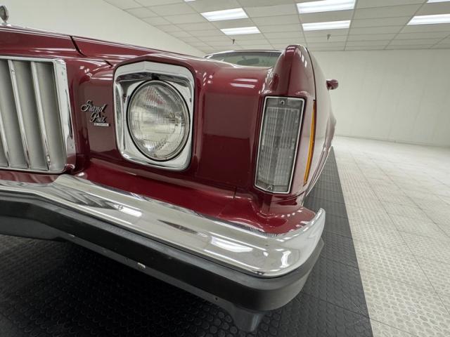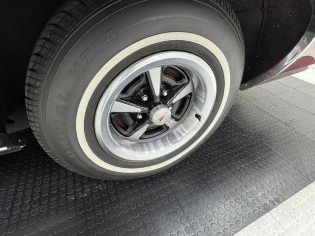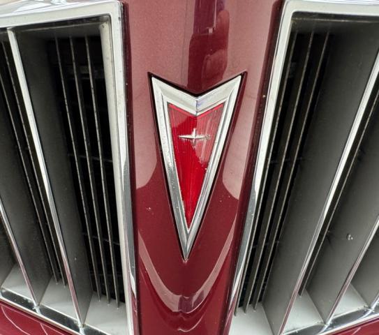 Honduras Maroon paint coats this car and a repaint was done in two stage application. To extenuate the raised portion of the pointed hood, a white pinstripe borders the proud section, then continues down the body of the car and around the raised section of the trunk. A white vinyl Landau style roof includes the fixed quarter windows and up front, the split grille surrounds the nose with the Pontiac emblem dead center, while single headlights make a final appearance on the Grand Prix in \'75. The tail lights were redesigned for \'75 and consist of five adjacent strips of light, flanking the fancy GP emblem over the keyhole and this is repeated on the hood ornament. 15-inch Pontiac Rally II wheels look just right and other than a small scratch by wheel opening trim, the paint and metal are in fantastic condition.