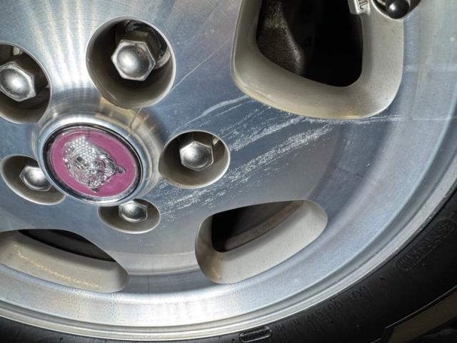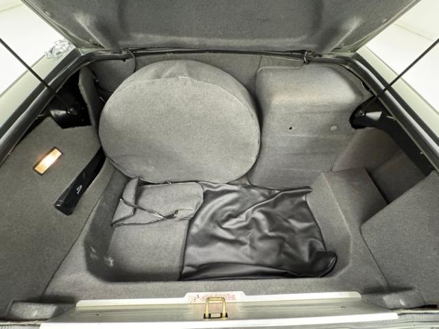 A swing of the doors reveals Oatmeal leather on the door panels with a wood veneer strip near the upper sill of each door and it looks fantastic, accompanied by a carpeted panel around the speaker. More honey colored burlwood covers other parts of the dash nicely and blends well with the beige leather, including that of the front bucket seats which are in very good condition, and we note a stain on the otherwise clean 2+2 rear seats. Back up front, the black gauges are embedded in a wooden faceplate in a concise array of instrumentation while the center is reserved for a clock and AM/FM/Cassette radio. A modest shifter resides in the center console, also framed in wood, flanked by ashtrays and accompanied by black switchgear, all presenting nicely. Low pile gray carpet covers the floor matched by the Jaguar mats and the deep trunk is finished with gray cloth panels.