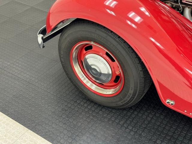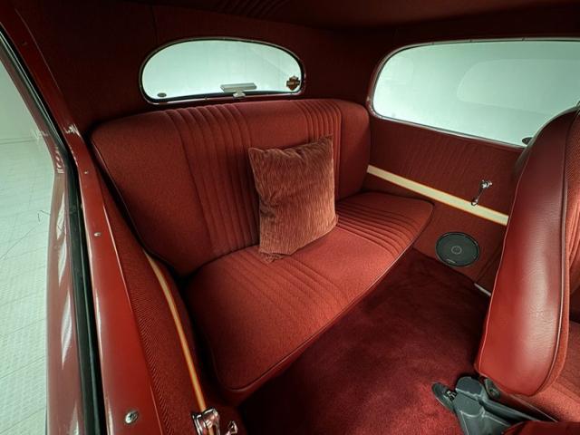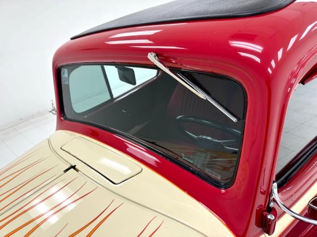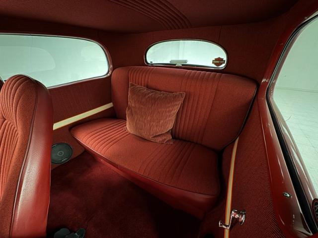 The stand out hood features a background single stage cream paint hosting very nice yellow to orange flames that reach all the way to the cowl and the drama continues as that cream is sent in band of color to encircle the cabin, bordered by orange and cutting through the red, adding enormous visual interest. As a street rod, the car hunkers down on Chevrolet Rally wheels, 14-inch in front and 15-inch in back, with a slightly raked stance and arching fenders connected by a wide running board. The rounded roof hovers over tinted windows and the rear deck has mock bullet holes suited for a moonshiner if this car was just a few years older! A fantastic, ornate grille fronts the car between red dot LED headlights, the metalwork and paint being in great shape. Imperfections include some cracked paint in a body bend, scratches, touched up blemishes, light roughness on the decklid, bubbling, chips, and a cracked window.