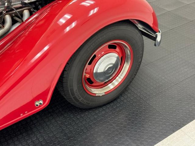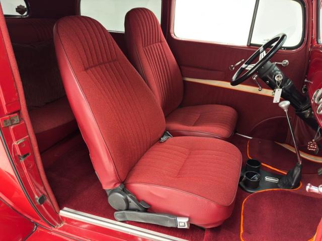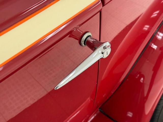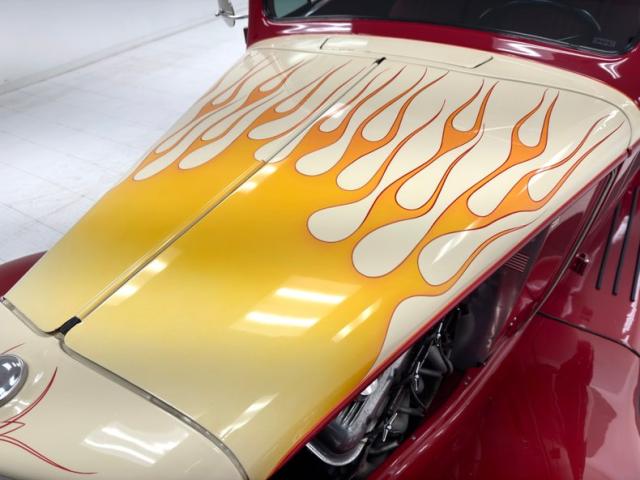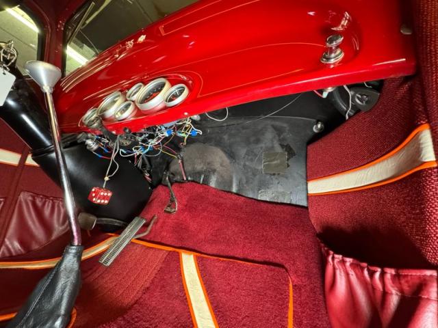 The design is carried to the interior where red tweed door panels feature a cream stripe bordered in orange, continuing on the rear side wall and transferred onto the front floor mat. The seats appear to be mid late century versions with tweed front surfaces and vinyl sides, buckets in front and bench in back. A sporty black steering wheel fronts the red painted dash with instrument cluster centrally located and housing a myriad of Stewart Warner black faced gauges with matching red needles. On the floor, a Lokar shifter extends up to the driver with dark red carpet cleanly covering the floor and a ribbed headliner presenting a bit of flair over our heads.
