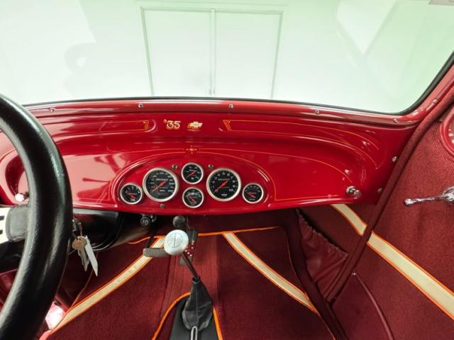 For consignment, a 1935 Chevrolet EC standard 2 door sedan showing 12,200 miles, but the true miles are unknown. This steel bodied street rod version is packing a 454ci V8, a wild paint job, and a clean interior.
