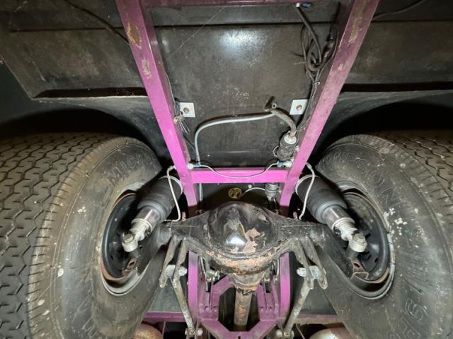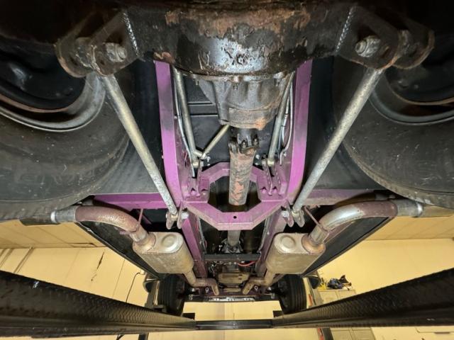 The boxed tube frame is painted purple on the underside that can best be described as driver quality. There\'s some surface rust around and some chipping purple paint, but not a build up of grease and grime or leaks are to be found. The dual exhaust flows into a pair of mufflers and then heads out the sides via chrome tips. Suspension consists of airbags at both ends with ladder bars augmenting the rear. The rear axle has been narrowed and the fat tires take up serious real estate in the back of the car.