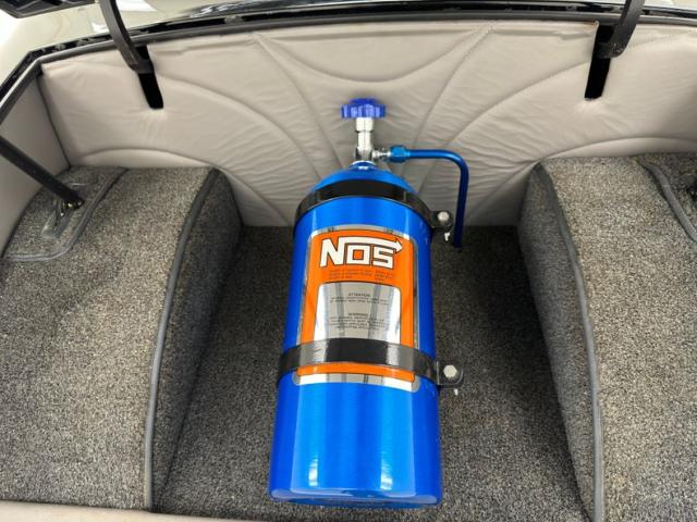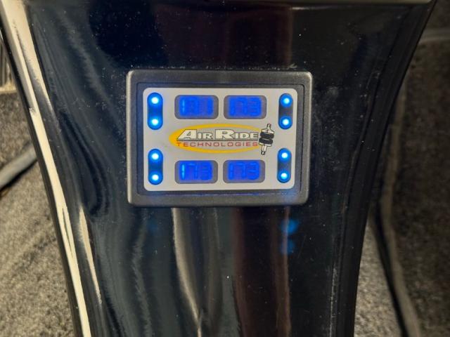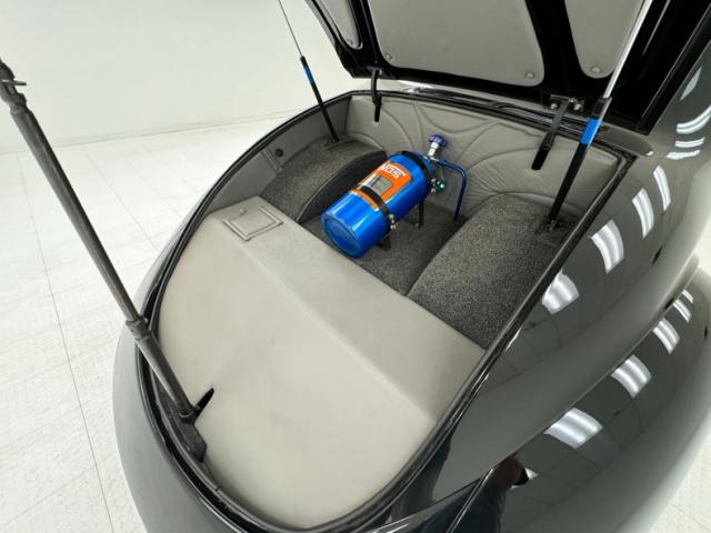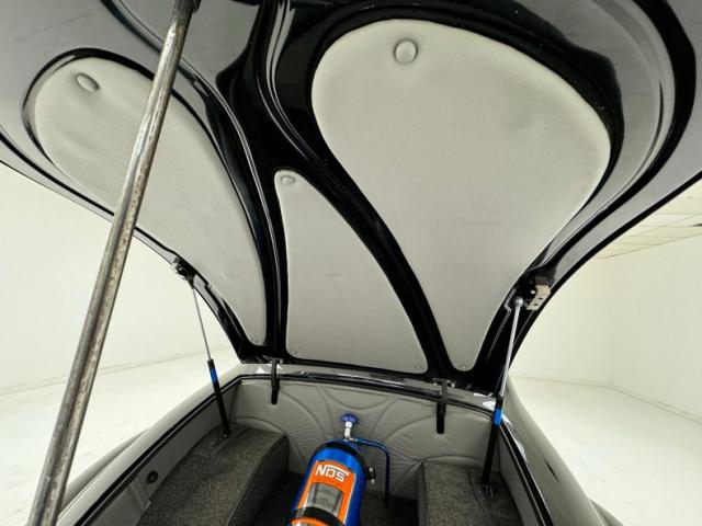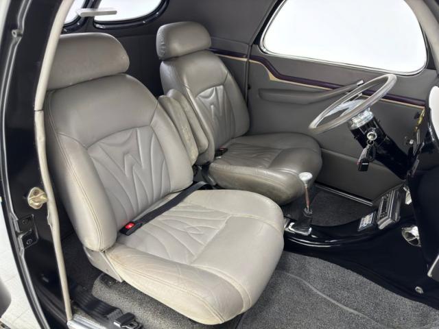 A tri colored leather graphic stripe spans the doors and flows to the back walls, all on a background of gray leather. A Willys \"W\" is cleverly stitched in the seat inserts of the tall bucket seats in gray leather with headrests and armrests on the inside. A wings style steering wheel is a familiar mod and fronts a glossy black dashboard filled with gold rimmed retro style VDO gauges for an attractive presentation. The center of the inky dash has a small A/C control panel, an AM/FM/CD player, and a digital monitor for the Air Ride suspension. A Lokar shifter rises from the floor, showing some patina on the shaft, and electric window toggles fall just behind it. Low pile gray carpet covers the floor with matching mats and the headliner is taut and gray. The trunk houses the inner fender wells and a bottle of nitrous, lined with the same gray carpet and stitched leather walls. The inside of the trunk lid is also dressed with gray leather fill pieces.