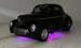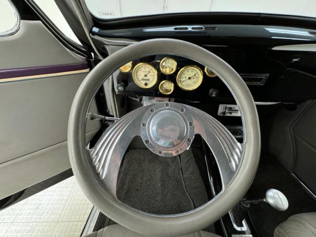 The distinctive shark nose and bottom feeding grille is flanked by single headlights with teardrop bezels that immediately contrast with the inky black paint which is immediately impressive on this fiberglass body. It is miles deep and like Jed Clampett\'s fortune, it\'s like a vat of crude oil, black gold. The black goes on forever in spectacular two stage coverage interrupted on the side only by a dynamic multi-hue painted spear that blips in the center like a heartbeat, then trails off to a point in the front. While we\'re at the side, there\'s no denying the wild shape of the Willys, surging forward with canted fenders, a rounded cab, a raked stance, and of course, the shark nose pointing forward. Small side mirrors adorn the car along with billet style wiper arms, while slit style tail lights barely make an appearance and do not disrupt the enormous black dome in back, topped by a split rear window with, yep, black trim. 15-inch Weld wheels act as shoes and the rears hold 33x19.5x15 meats. Save for a scratch and some rock chips on the front face of the rear fenders, the exterior is flawless. Purple neon lights illuminate under the car for show time shenanigans.