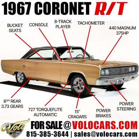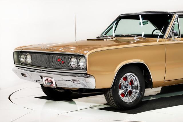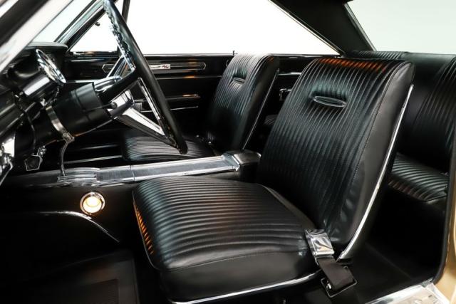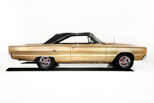 EXTERIOR: This Dodge Coronet R/T has a bold, masculine body style with fit and finish that is truly outstanding. The body is laser straight from front to back, and the panels align with the kind of precision you\'d expect from a new car. The R/T hood louvers add just the right touch of muscle car attitude, perfectly complementing the car\'s aggressive lines. Repainted in its original Spanish Gold, the metallic finish is laid out evenly with exceptional depth and clarity. The clear coat has been polished to a brilliant shine and feels slick to the touch. Overall, the chrome and trim are straight, bright, and sparkle beautifully. The windshield is brand new, while the remaining glass retains its original Mopar stampings and remains in good condition. The vinyl top is in excellent shape, the jambs are clean, and the weatherstrips have been replaced. Completing the look is a brand new set of 15-inch Cragar wheels wrapped in BFGoodrich tires, giving the car the perfect stance.