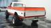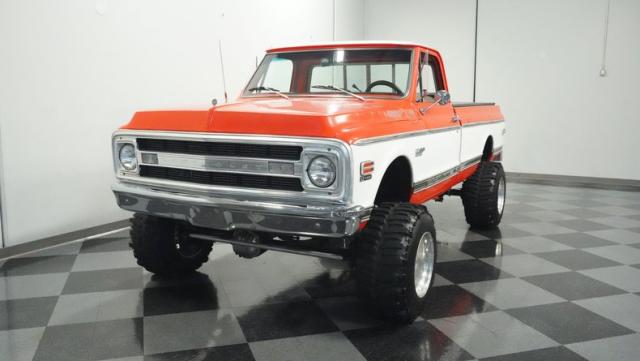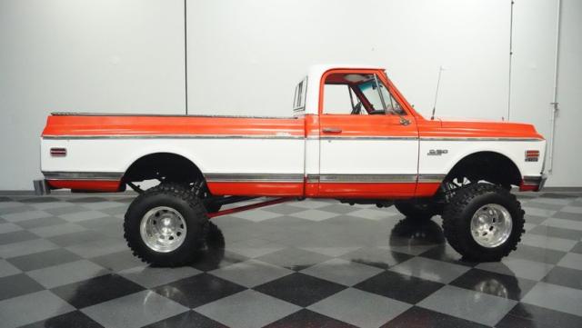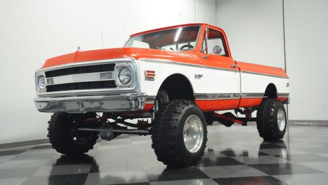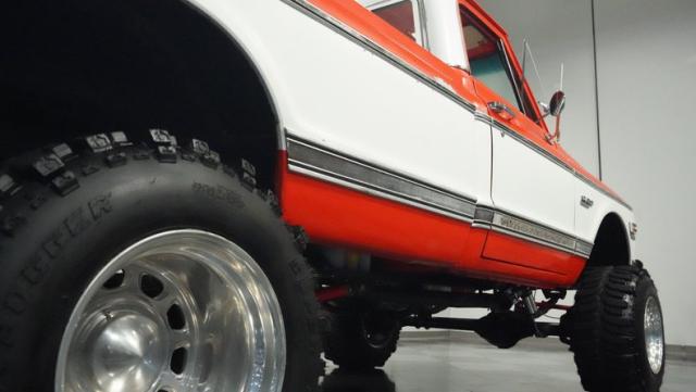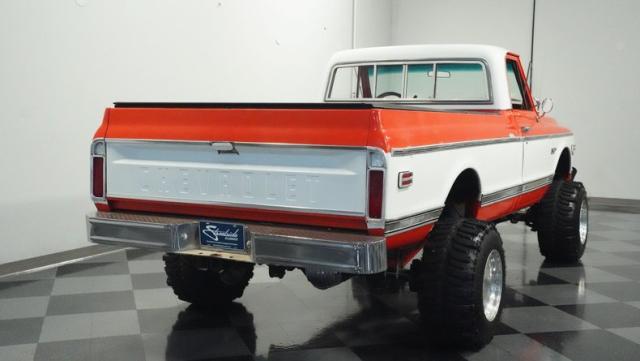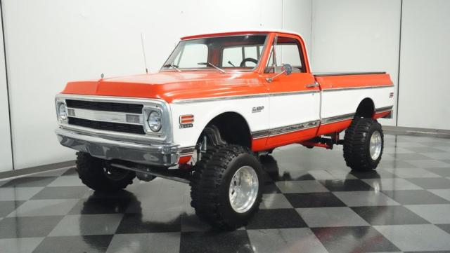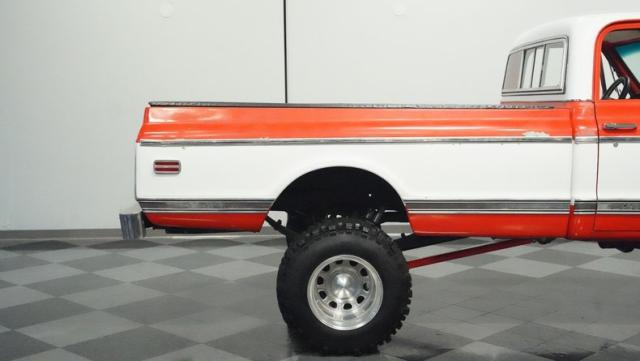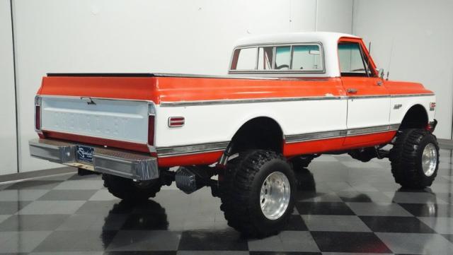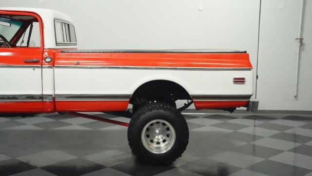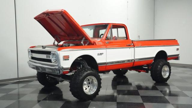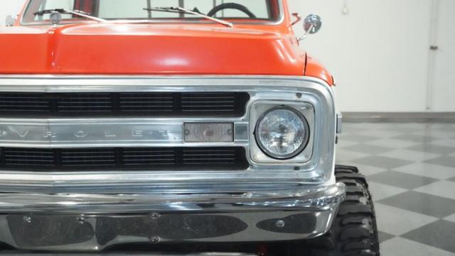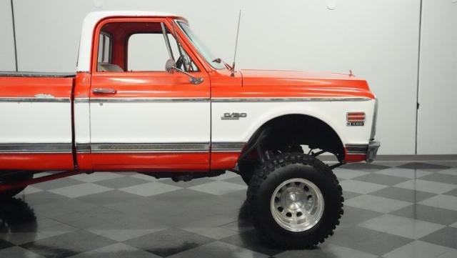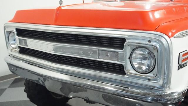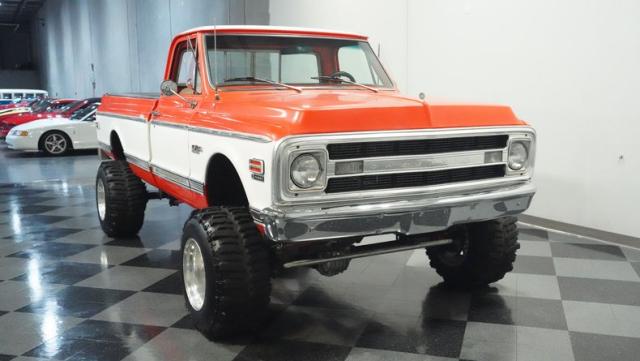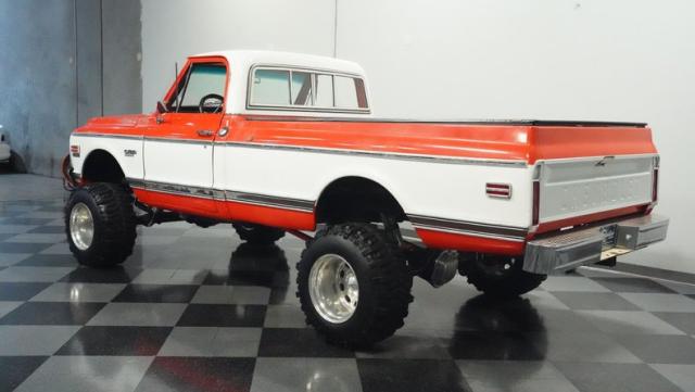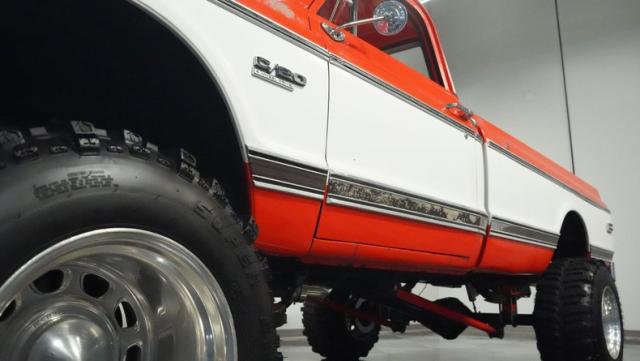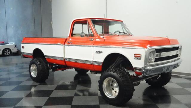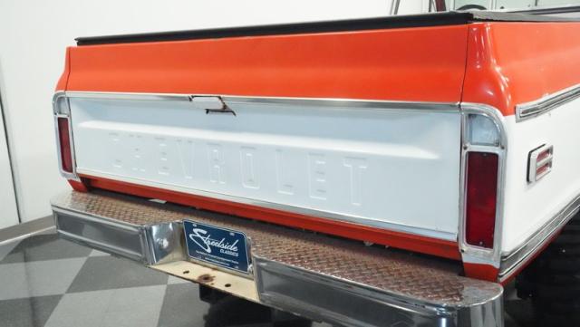 Built for conquering trails and dominating backroads, this orange and white 1970 Chevrolet C10 4x4 blasts through boundaries with go-anywhere attitude. A distinctive GMC hood ornament crowns the front while towering on a muscular lifted stance. Massive 33x14.5R16.5 TSL Bogger tires dig deep into any terrain, mounted on rugged 16.5-inch Weld wheels that amplify the truck\'s off-road DNA. Bilstein remote reservoir shocks at each corner eat up rough terrain. The truck bed\'s clean cover keeps gear protected while dual exhaust tips signal this machine\'s raw power.