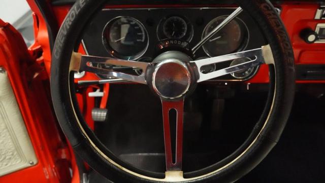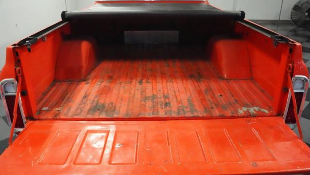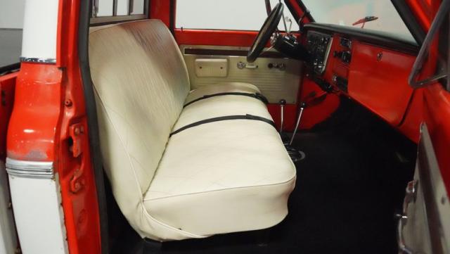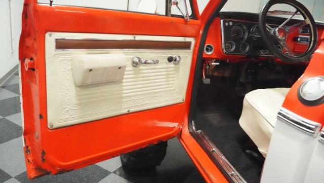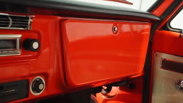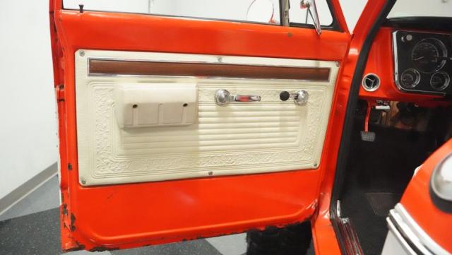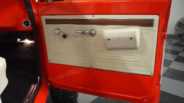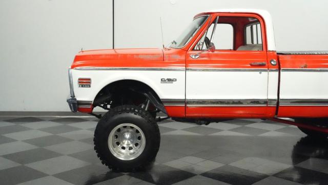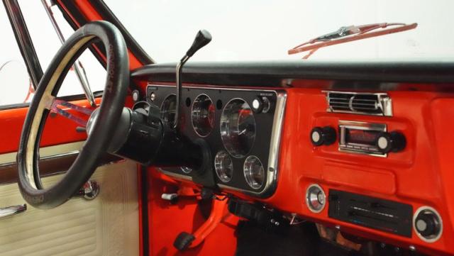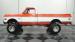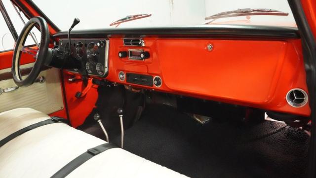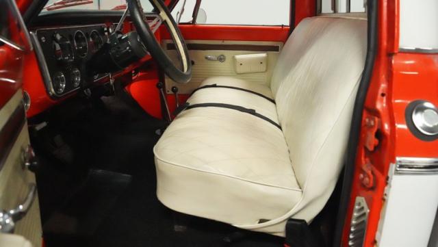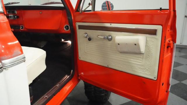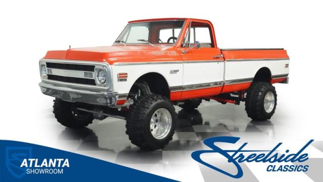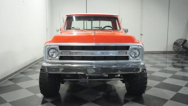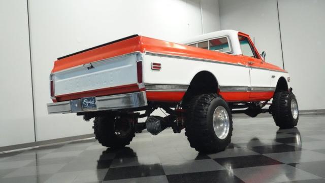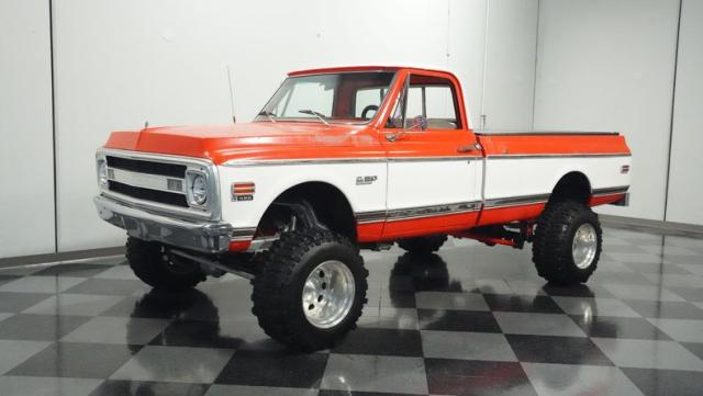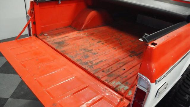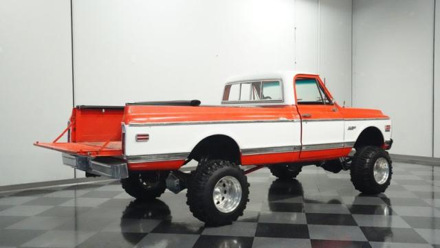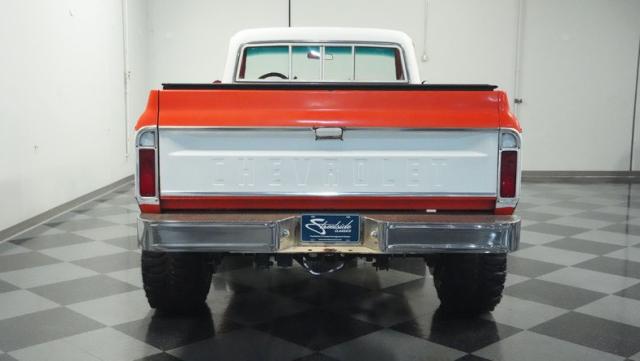 Built for conquering trails and dominating backroads, this orange and white 1970 Chevrolet C10 4x4 blasts through boundaries with go-anywhere attitude. A distinctive GMC hood ornament crowns the front while towering on a muscular lifted stance. Massive 33x14.5R16.5 TSL Bogger tires dig deep into any terrain, mounted on rugged 16.5-inch Weld wheels that amplify the truck\'s off-road DNA. Bilstein remote reservoir shocks at each corner eat up rough terrain. The truck bed\'s clean cover keeps gear protected while dual exhaust tips signal this machine\'s raw power.