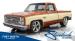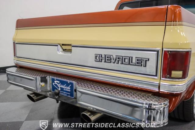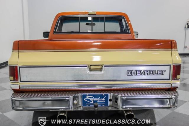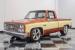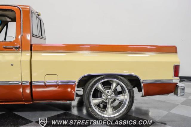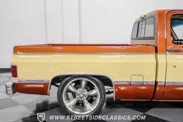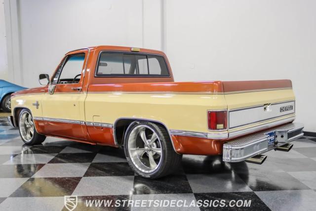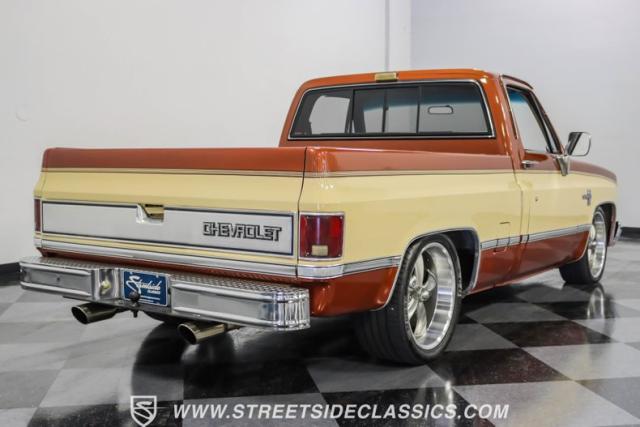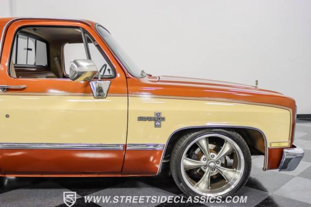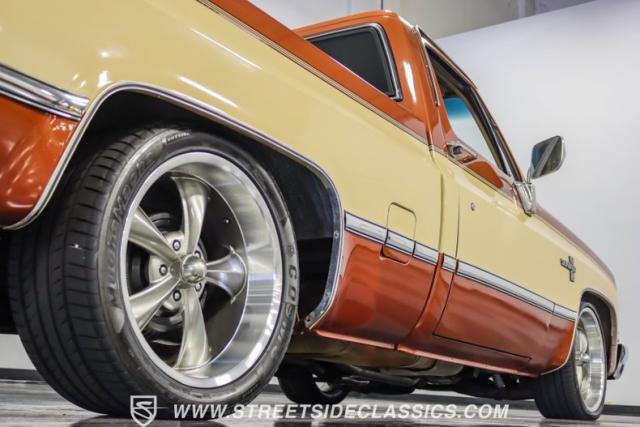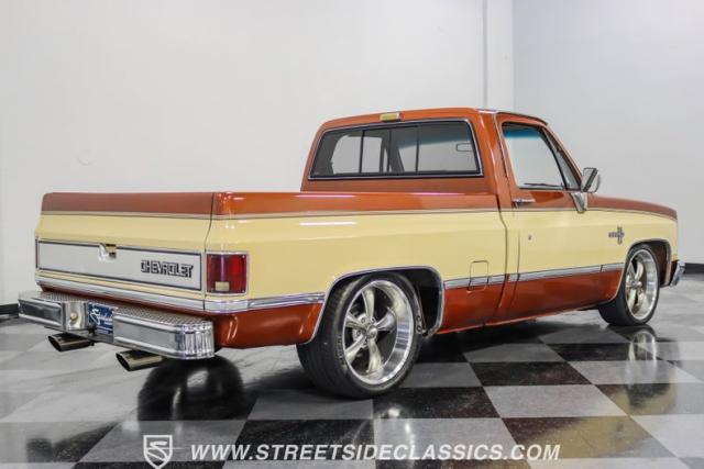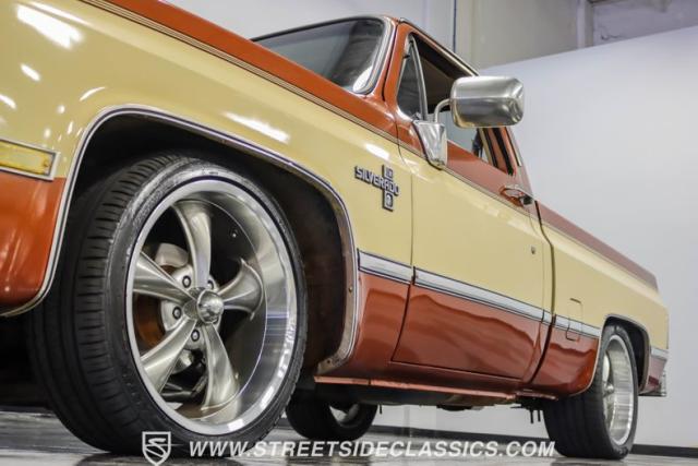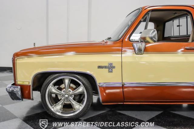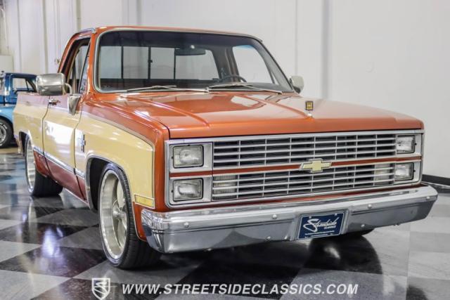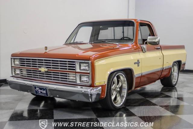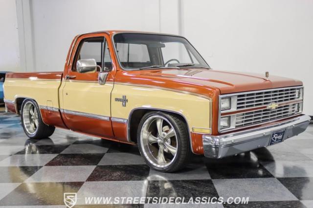 This 1983 Chevrolet C10 Silverado boasts a $12,000 mechanical refresh, making it a prime example of American muscle in pickup form. The light bronze exterior exudes confidence on the street. Its aggressive profile comes from a lowered stance and 20\" Ridler wheels. The front sports 245/40R20 tires, while the rear showcases massive 315/35ZR20 rubber, both with ample tread. A Rhino-lined bed adds utility, and the dual exhausts amplify its muscular presence. The sliding rear window and tinted glass complete the truck\'s bold look.