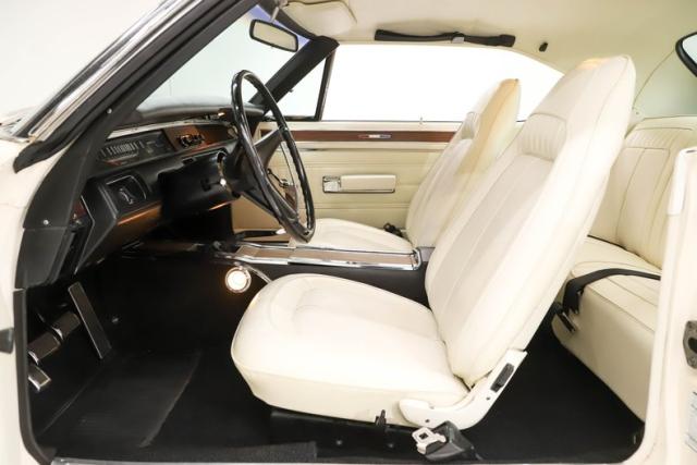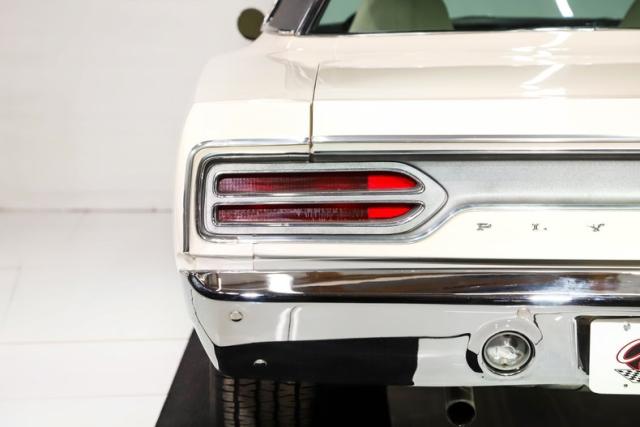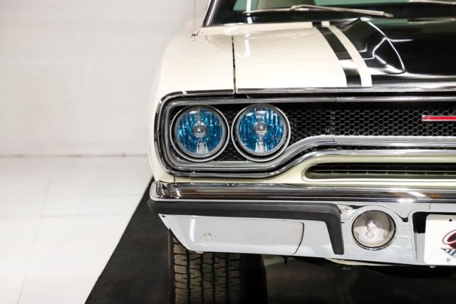 EXTERIOR: It\'s a Road Runner in disguise! Super cool raised hood with a 383 callout and black stripe. Beautiful clean and straight metal all the way down the side of the body with smooth contours and crisp lines. All the panels are aligned correctly with good consistent gaps. The doors close easily with minimal effort, even if the windows are up. The Alpine White paint was neatly applied then polished to a smooth and slick finish. The black vinyl top looks totally fresh. All the chrome and bumpers are shiny and sparkly. The honeycomb style front grille is in great shape and the headlights were upgraded with high intensity units. All the glass is crystal clear. It has four brand new chrome Magnum 500 wheels: 15x7s in front, 15x8s and back.