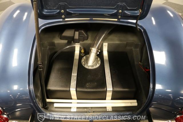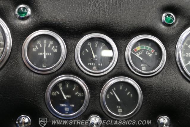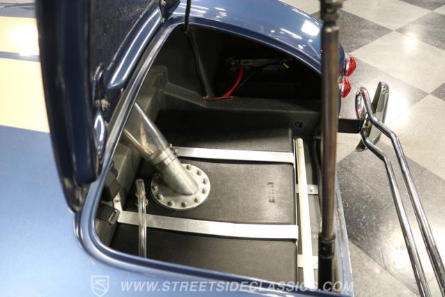 The black interior has the simple and purposeful style you want in a Cobra. Low-back bucket seats, toggle switches, a sports steering wheel, and full classic Stewart Warner readouts engage your driver senses. There are nice details like the upholstered door panels and back. But just like the exterior, nothing ever gets in the way of a true driver. You even have nice additions like the wind wings and strong diamond plate floor on the driver\'s side.