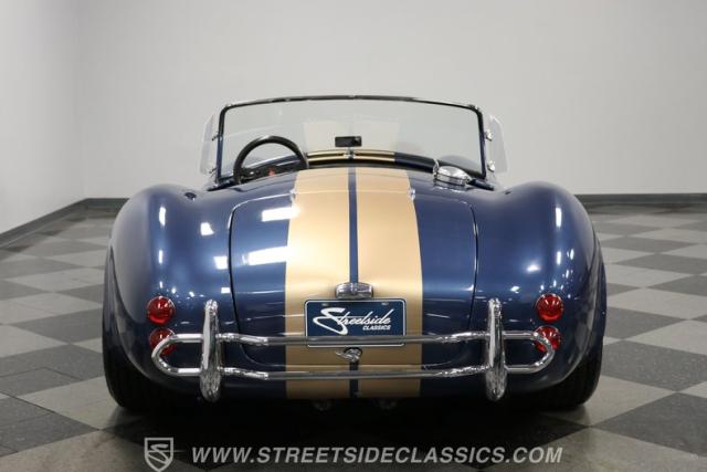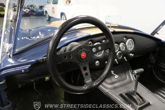 This car has all the right standard Cobra features you love, like the widely flared fenders, hood scoop, race bumpers, and growling side pipes. Plus, the genuine Halibrand magnesium wheels with knock-off center hubs really make this worthy of the icon. But there\'s plenty of uniqueness on display here, too. After all, blue is a great Cobra color, but we rarely see it paired with golden stripes. It\'s all quite striking, but nothing here is too fancy from keeping you from hitting the racetrack. And that uniqueness and race-ready attitude are quite right for this one. The story that we are told is that this is a Steve Arntz replica, and he was a designer for Carroll Shelby who really started the movement for new fiberglass builds as early as the 1970s. And the engineer on the project is said to be Ron Butler. He was a crew chief when the Ford GT40 had its historic 1-2-3 finish at the 1966 24 Hours of LeMans. So this is a distinct car with a possibly unbeatable pedigree.
