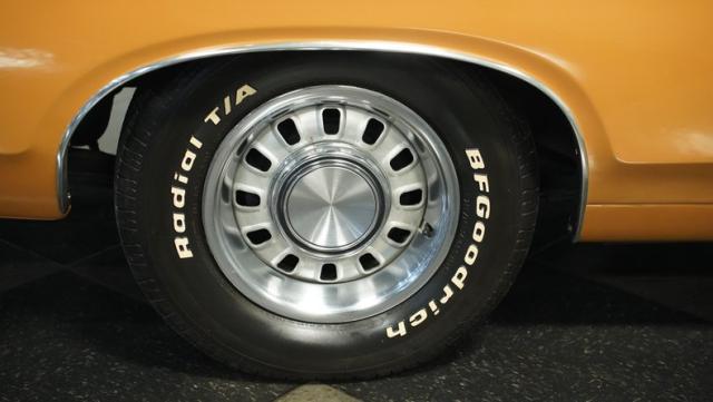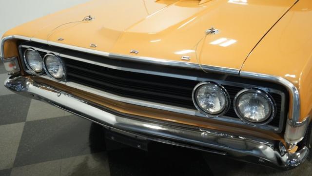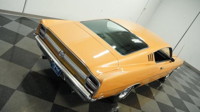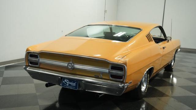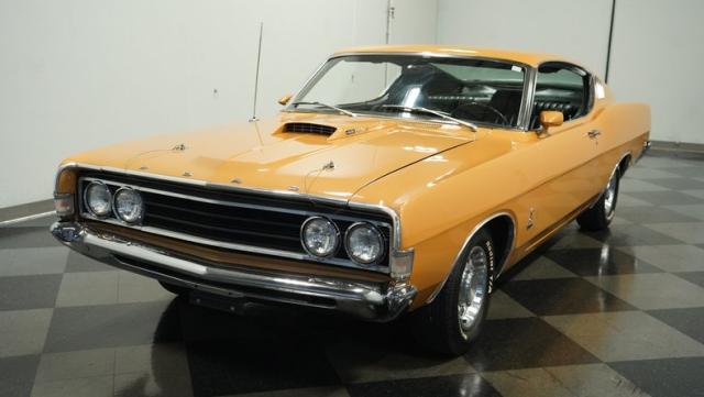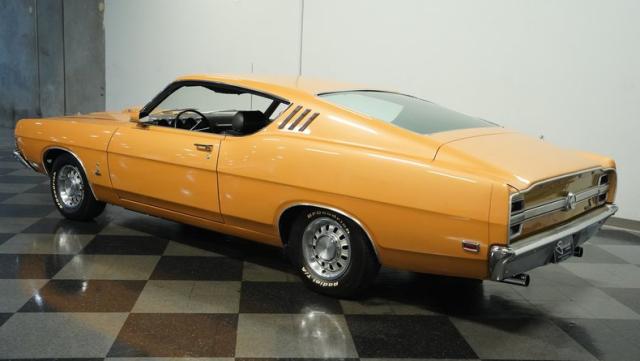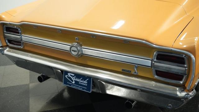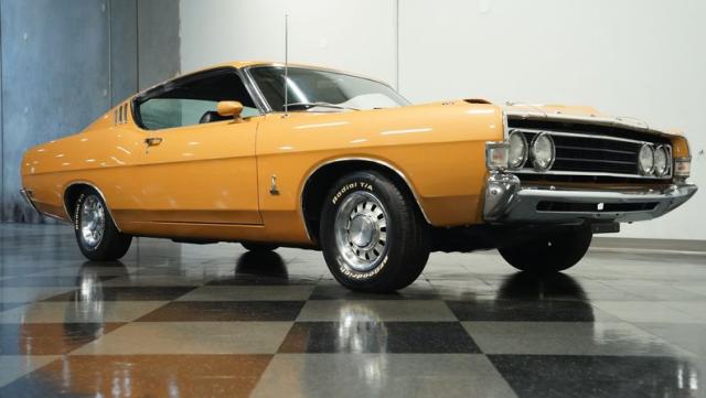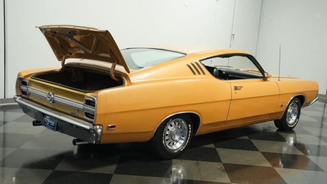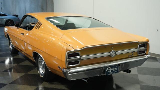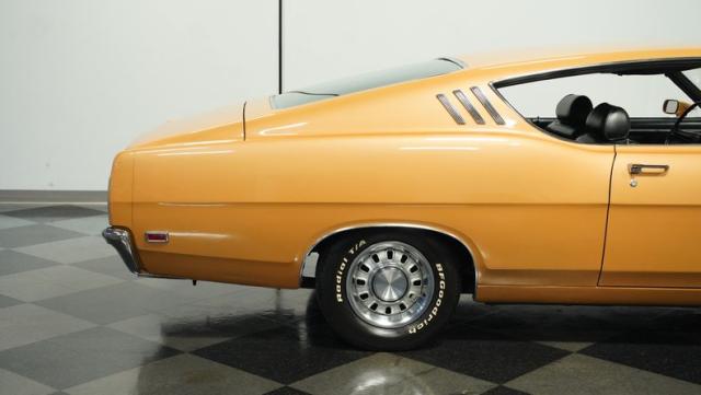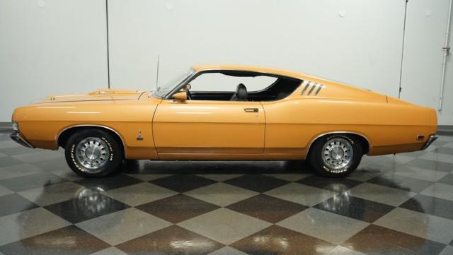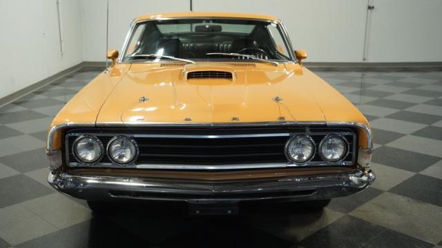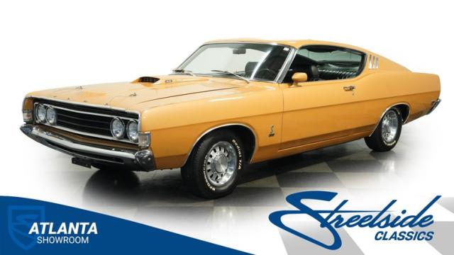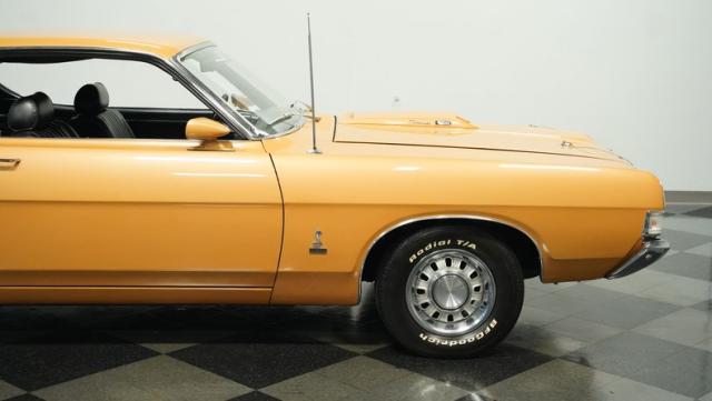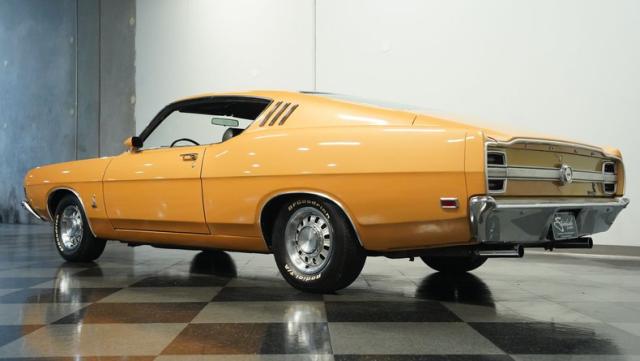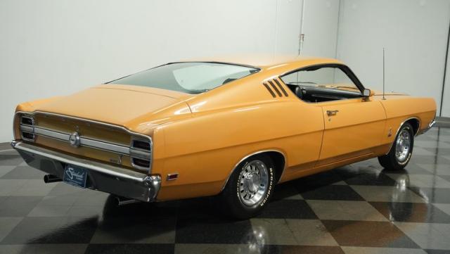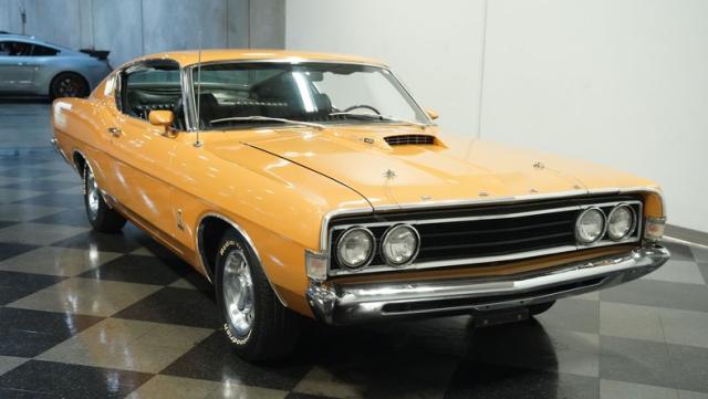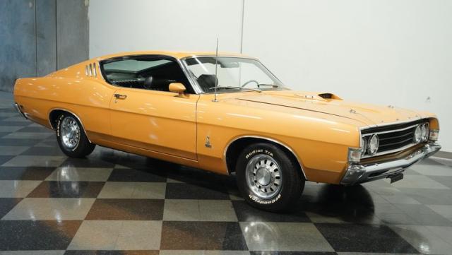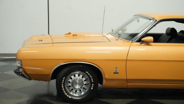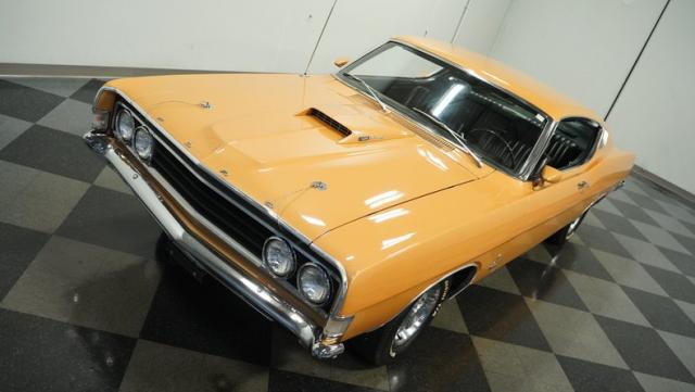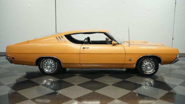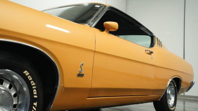 This 1969 Ford Torino Cobra 428 Cobra Jet radiates pure muscle car energy. Cloaked in Gold Glow paint, this fastback\'s aggressive lines catch the eye and refuse to let go. The Cobra\'s menacing stance is amplified by 14-inch wheels wrapped in 215/70R14 rubber, ready to lay down serious rubber. From its imposing grille to the sculpted rear end, every angle screams performance.