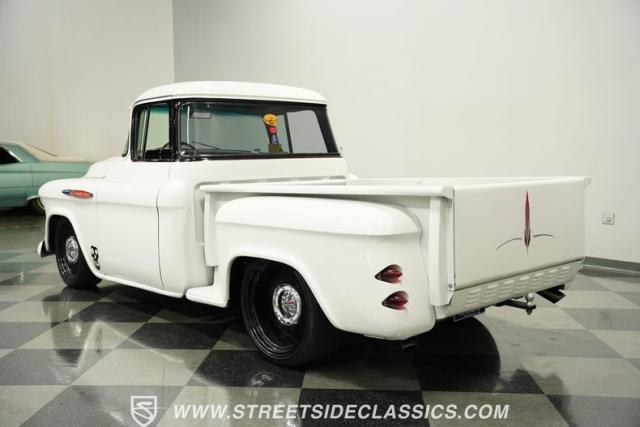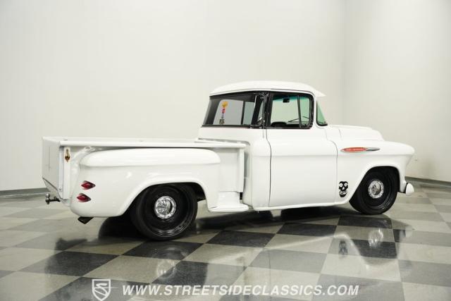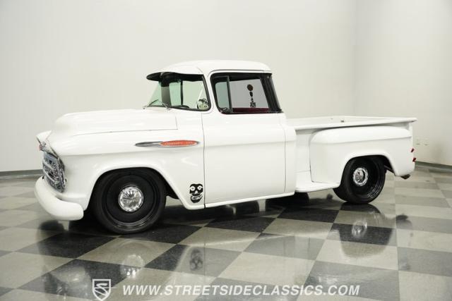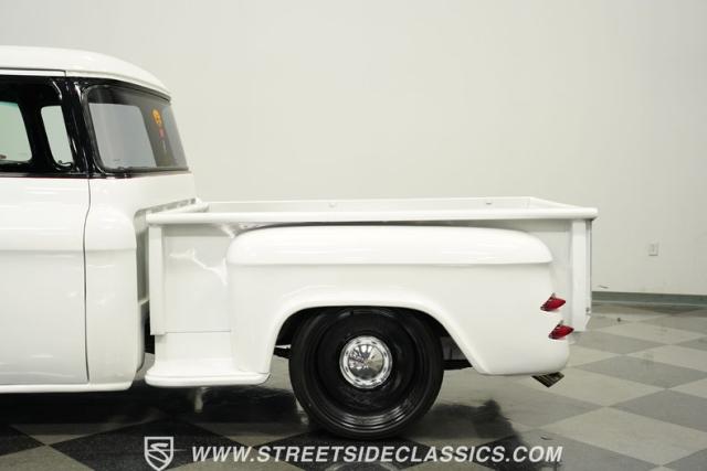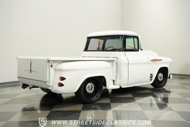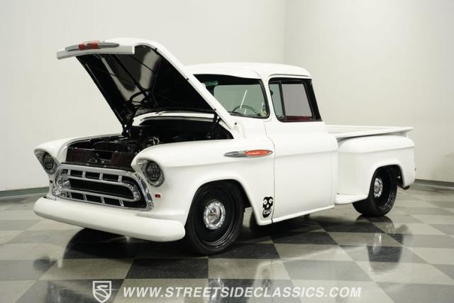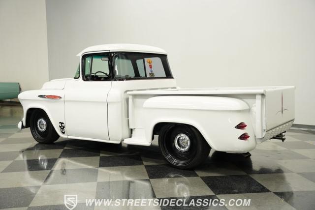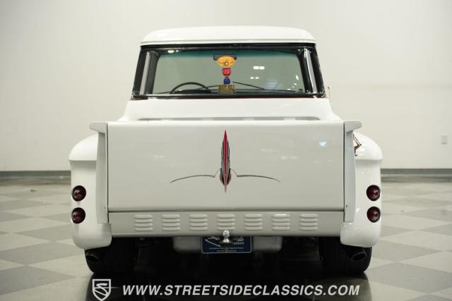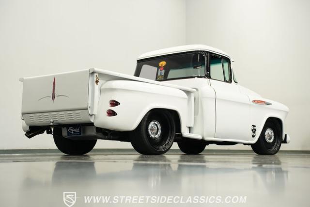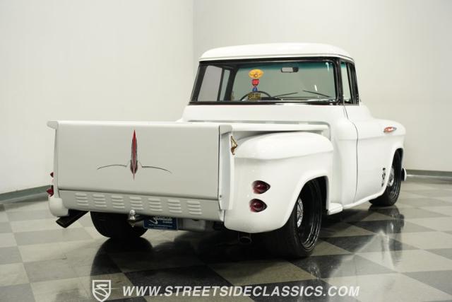 Cool custom short-bed trucks are always in style and make for big hits at car shows and cruises. This 1957 Chevrolet 3100 Big Back Window cruiser will turn heads no matter what event it shows up to. The crisp white paint job and pinstriping in the front and rear go perfectly with the black Detroit Steel wheels, painted white bumpers, chrome front grille, LED headlights, and the custom frenched rear taillights tucked into the rear fenders. The door handles are shaved along with the tailgate handle. The truck bed looks outstanding, just like the rest of the truck. And just in case you need to tow something, there is a trailer hitch under the rear bumper.