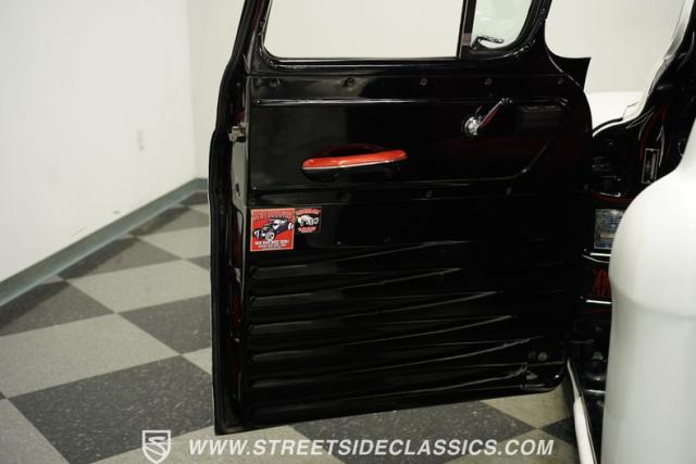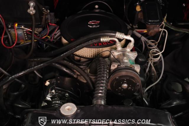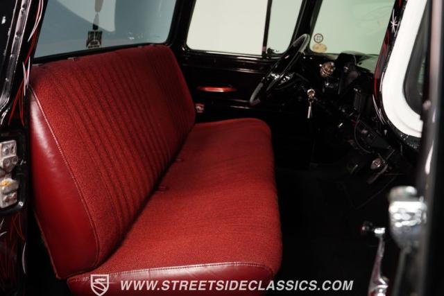 The interior carries an original/custom vibe. The red bench seat sets off the mostly black cabin. The original Chevy gauge cluster is paired with a Mooneyes tachometer and three AutoMeter gauges: Fuel, Water Temp, and Oil Pressure. A Holley Sniper Fuel Injection Control unit sits to the right of the steering wheel, helping the driver keep a closer eye on engine activity. The door panels are in good shape, as are the dashboard and custom headliner. Door jambs, dashboard, and glove box all feature creative pinstriping designs. The custom steering wheel looks sharp, and the shifter lever topped with a grenade knob adds a unique touch. Altogether, it\'s a well-done classic look for the interior.