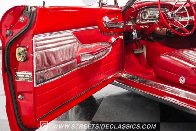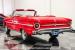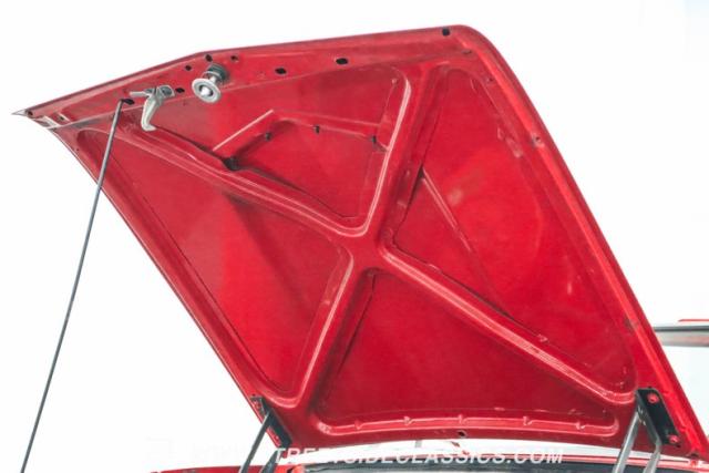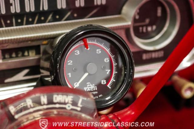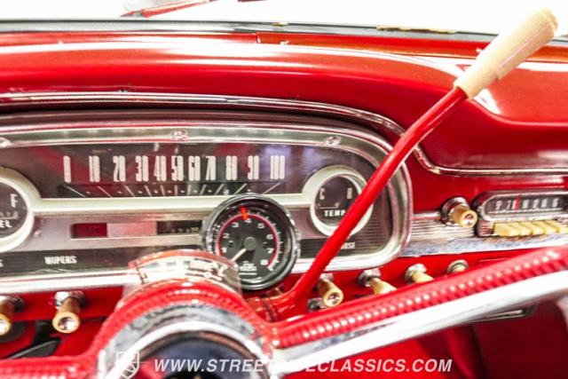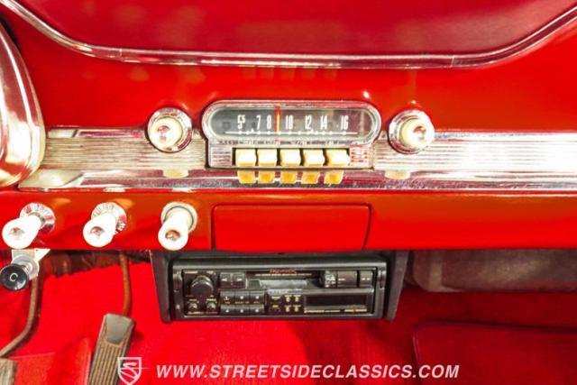 The red vinyl interior radiates classic Ford style with bucket seats and a sporty console setup defining the cabin\'s character. An Equus Pro Tach mounted on the steering column adds a performance touch, while the Pioneer AM/FM cassette player mounted under the dash delivers modern audio capabilities. The power-operated convertible top mechanism brings open-air freedom at the touch of a button. Chrome accents throughout the cabin complement the red vinyl upholstery, creating an environment that perfectly balances sport and luxury.