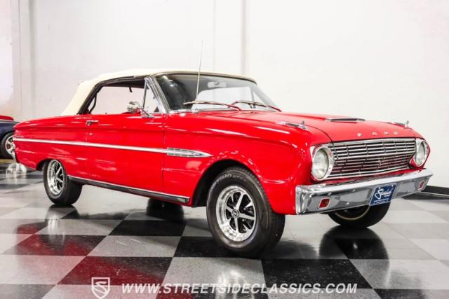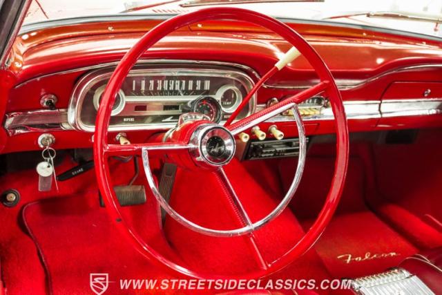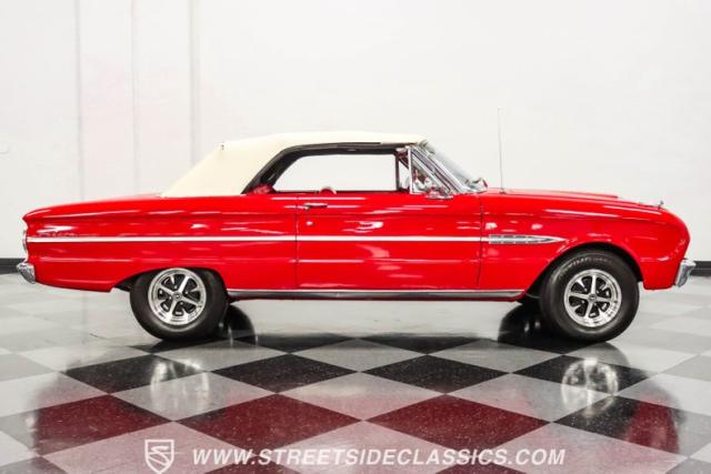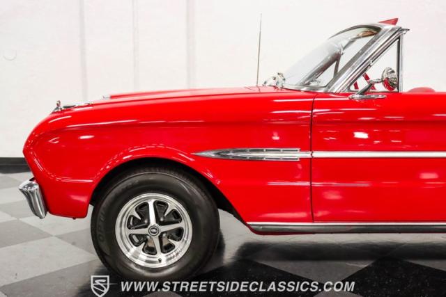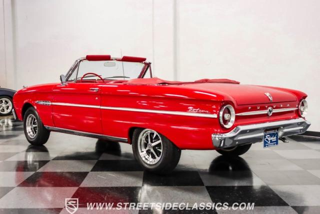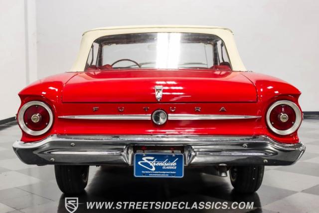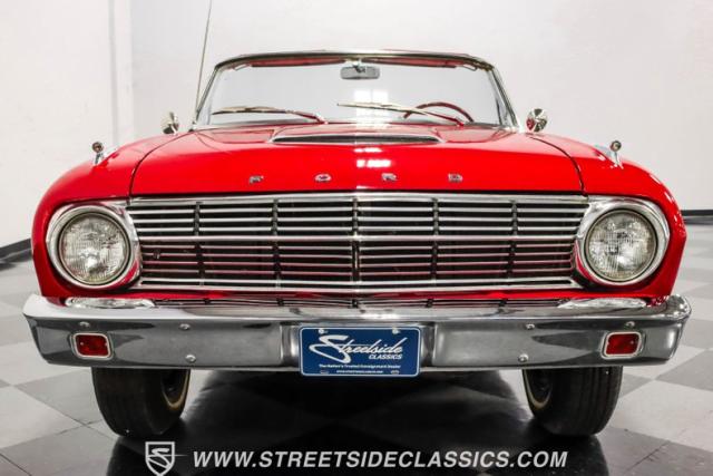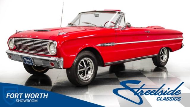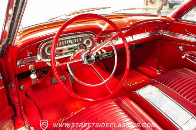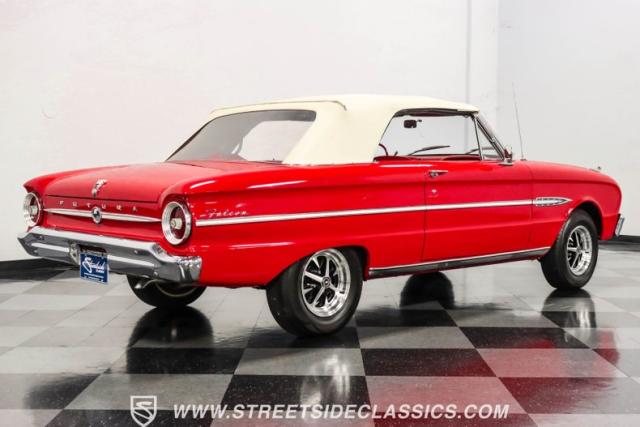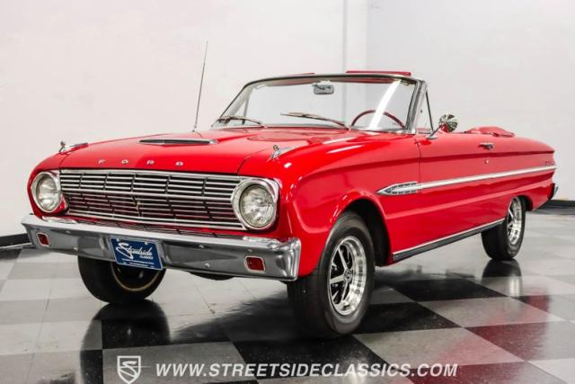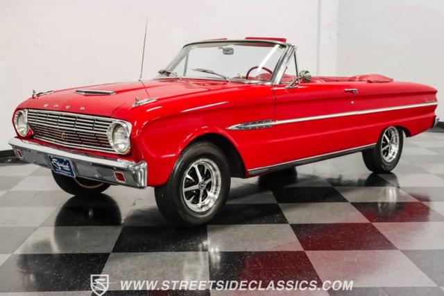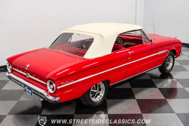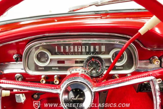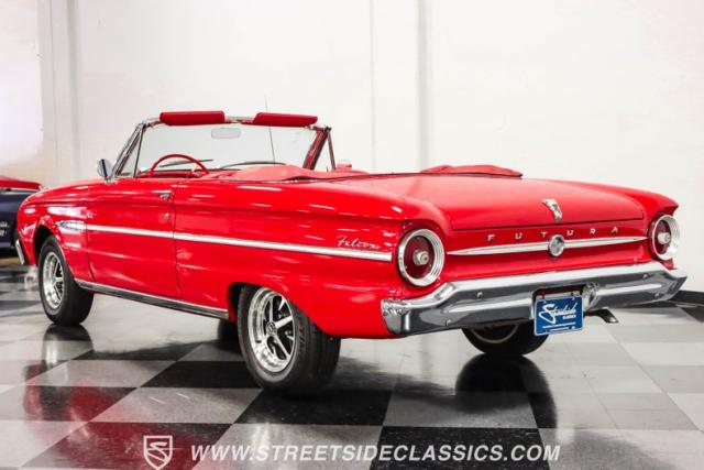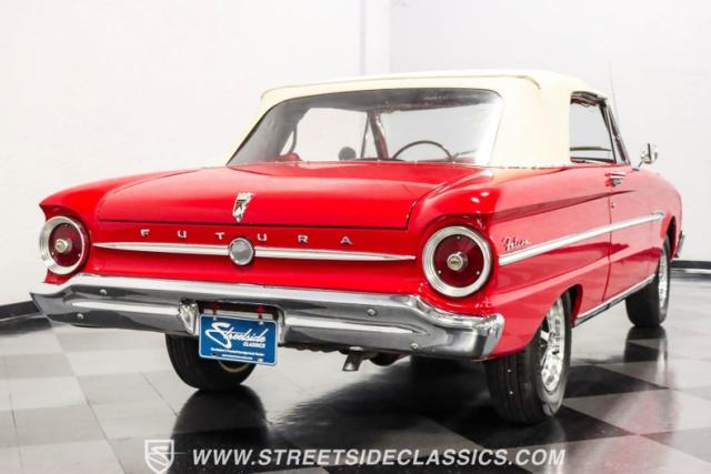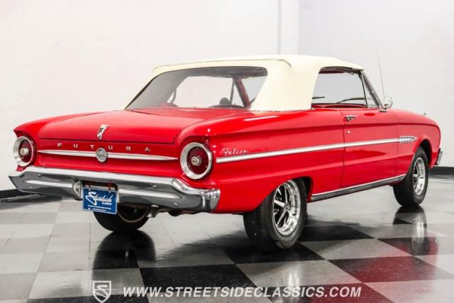 The 1963 Ford Falcon Futura Sports Convertible was more expensive than a V8 Fairlane 500 hardtop when new - making it a premium offering in Ford\'s lineup. The Rangoon Red finish amplifies every sleek curve of this drop-top, while the crisp white vinyl convertible top and matching boot cover create a dynamic contrast. The classic styling continues with the chrome bumpers, distinctive grille, and period-correct 14-inch wheels. The factory side trim adds a flash of brilliance, while the 205/75R14 Hankook tires plant this convertible firmly on the pavement.