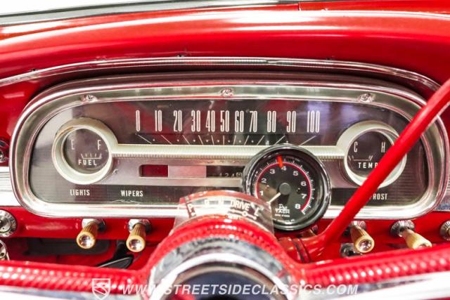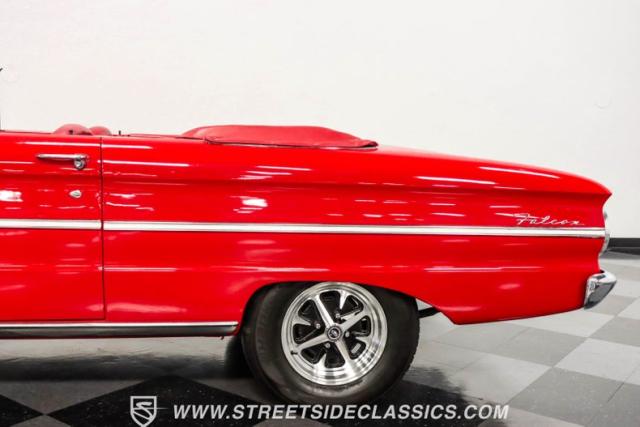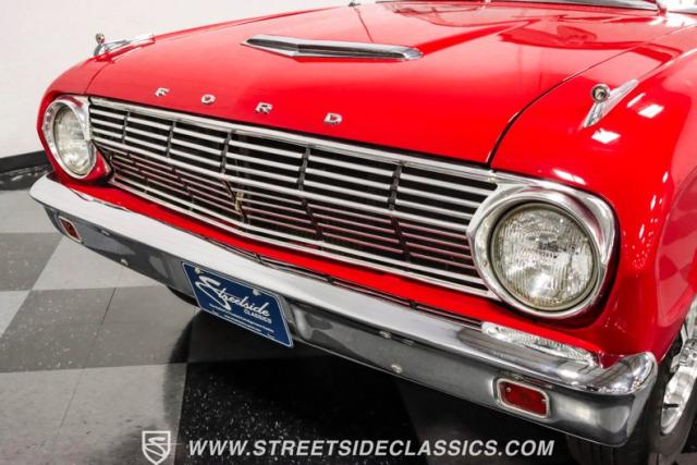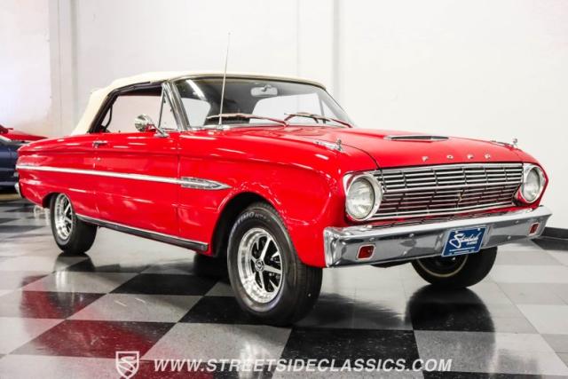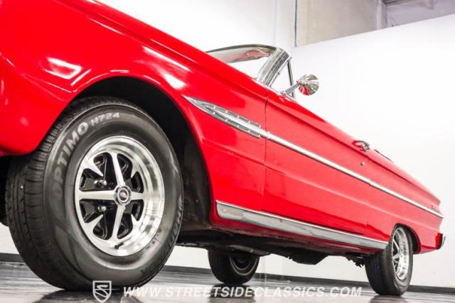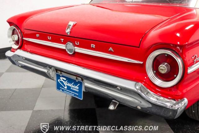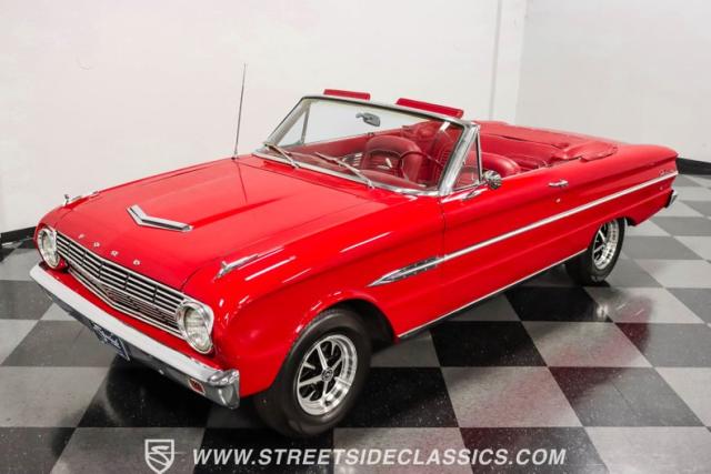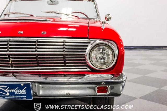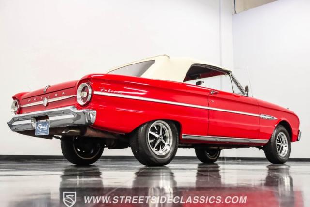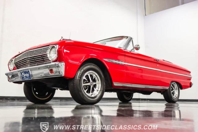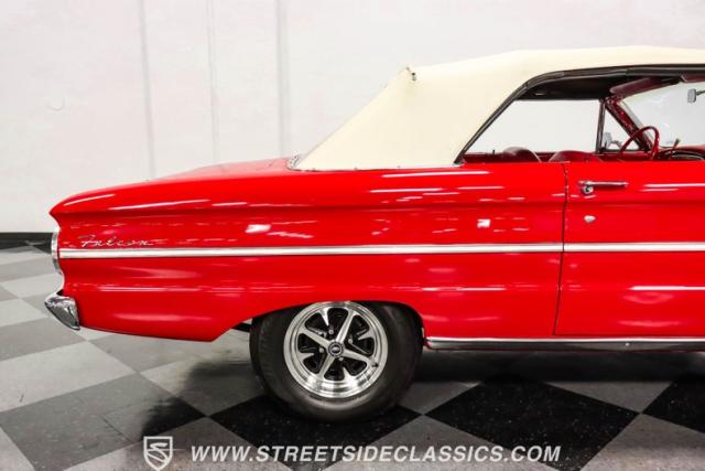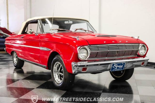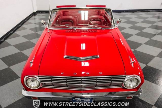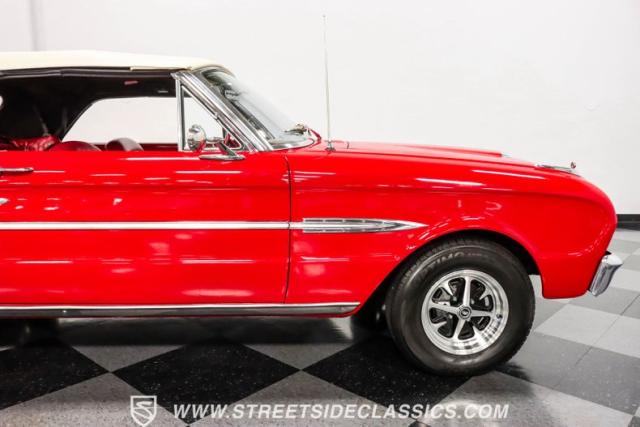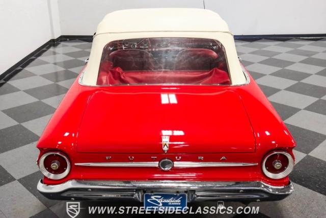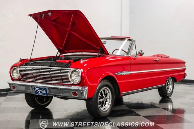 The 1963 Ford Falcon Futura Sports Convertible was more expensive than a V8 Fairlane 500 hardtop when new - making it a premium offering in Ford\'s lineup. The Rangoon Red finish amplifies every sleek curve of this drop-top, while the crisp white vinyl convertible top and matching boot cover create a dynamic contrast. The classic styling continues with the chrome bumpers, distinctive grille, and period-correct 14-inch wheels. The factory side trim adds a flash of brilliance, while the 205/75R14 Hankook tires plant this convertible firmly on the pavement.
