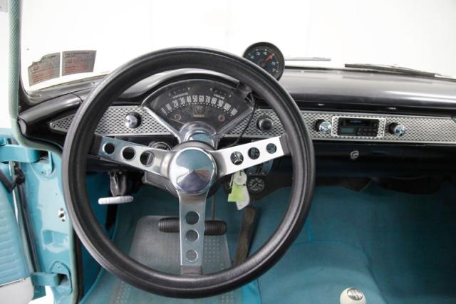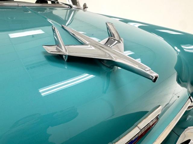 The recipient of a 1998 frame on restoration and bathed in turquoise with white, and it does not get any more Mid-Century Modern color-wise than this. Paint presents well with only minor evidence of inclusions and some cracking of the paint underneath, as does attached correct brite-work, badging, and chrome. This car oozes simplicity as the first version with its simple chrome grille, bumpers, and a streaking jet hood ornament that has flown its way to the end of the hood to announce the cars arrival into the jet age and yours at the drive in. Nicely done taillights, a lack of any fins, and wonderful stainless window trimmings and surrounds, add to the aura with the paint combo. We bottom out with 15\" rally wheels wrapped in blackwall rubber.
