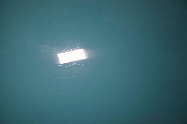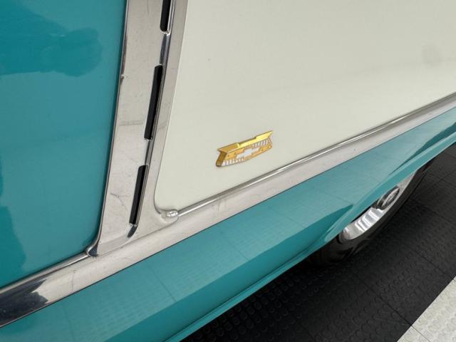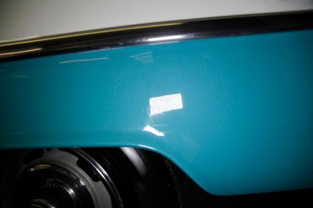 Step into the time machine Peabody and Sherman, as we open the door, we are met with styling right out of 1955 and all correct I might add. Broadcloth turquoise and white stitching upper panels in the door, bounded by square embossed white vinyl, then a little clearer broadcloth turquoise on the bottoms, and this is just the door panels! Moving our eyes inside we can see more turquoise stitched checkerboard and mix in a lot of pristine white vinyl for the bolsters, front and rear seats, and we are in true greaser/DA heaven. A black metal dash with the iconic twin eyebrow shaped fans house the speedometer, and passenger badging while in between the fan we note a bowtie perforated panel that houses the AM/FM/Cassette stereo. Mounted atop the dash is an AutoGauge tachometer and mounted down low are a pair of Autogauge gauges to assist with engine monitoring. A turquoise carpet floods the floors and presents with minor soiling and in the center is a Hurst Super Shifter. Above a stained turquoise headliner hangs tightly and is missing its courtesy light cover.