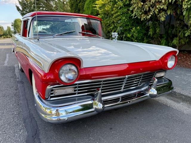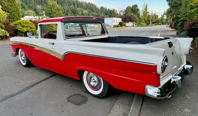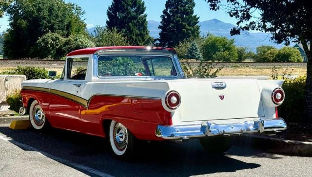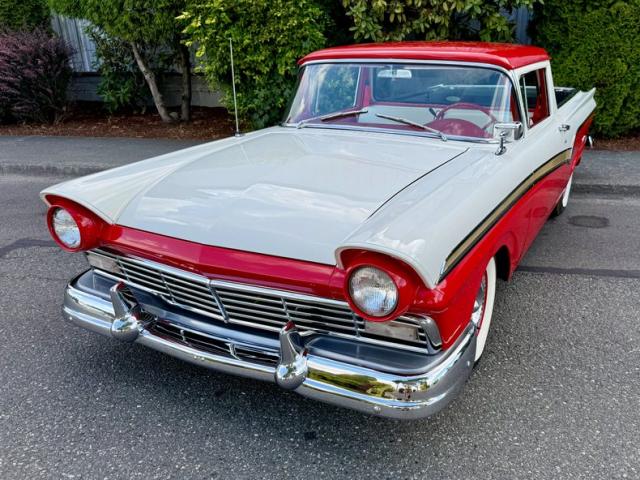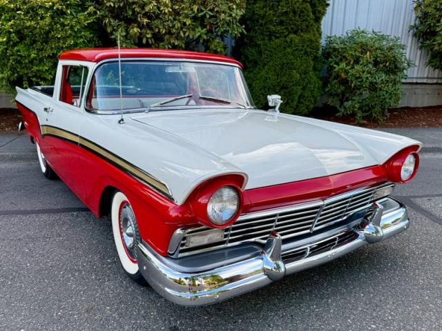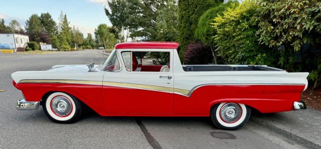 \"Presenting a truly stunning 1957 Ford Ranchero DGT1570 (VIN: C7RF151570). From the moment you lay eyes on it, this Ranchero is a head-turner. Open the door to reveal a breathtaking red and white interior, meticulously restored and showcasing the classic charm of the era. The dashboard is a work of art itself, featuring a brushed metal finish and a suite of precision Stuart Warner gauges, providing a touch of vintage racing flair.