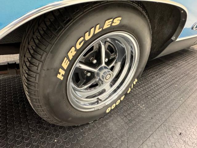 Attractive black inner doors include a woodgrain panel with matching black grains and a black vinyl door pull with silver hardware and they\'re just about picture perfect. Tall back black grain vinyl bucket seats reside in the front with a horizontal stitched pattern and they\'re in great shape continuing to the back bench where we note a pair of speakers mounted to the package shelf. Back in front, a 3 spoke steering wheel sharing its column with a shift light and leading to a horizontal gauge cluster, and a speedometer that saves space and weight by not including zeros, so that 15 at the end translates to 150 mph. The original AM/FM is in the dash while an updated unit with CD is mounted underneath along with some extra gauges. Wood applique continues throughout the dash and onto the center console where the Hurst shifter awaits. Black loop carpet below, black headliner and shoulder belts above, all in great shape. A rust free trunk includes a vinyl plaid mat and spare tire. We note some broken foam on the dash pad.