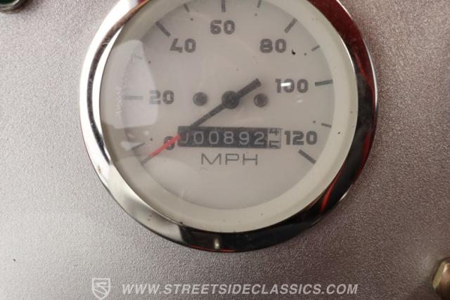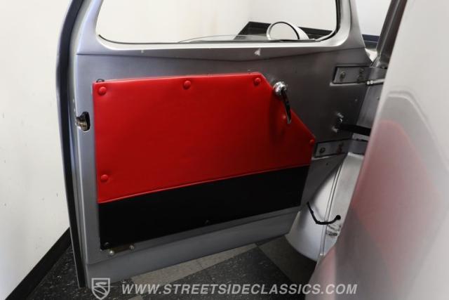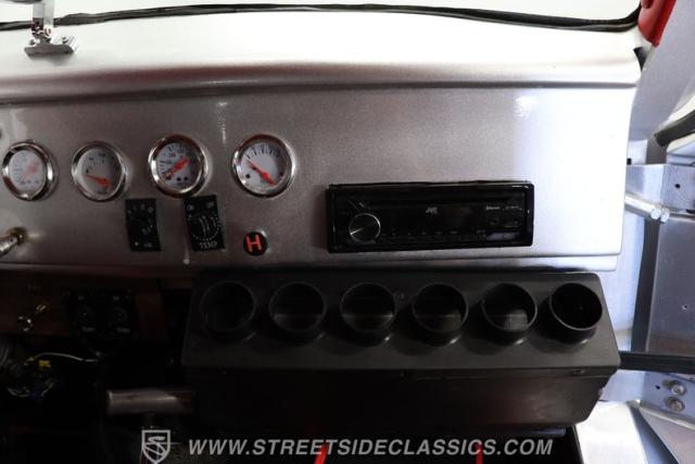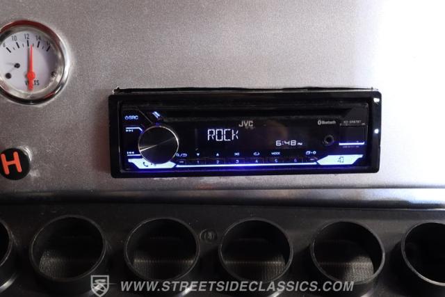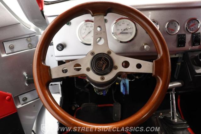 The interior echoes the same theme, sporting a pair of aftermarket black and red bucket seats with pronounced bolsters for extra support during spirited driving, with a B&M ratchet shifter in between them. The dash area has been painted to match the exterior, with a Grant woodgrain steering wheel added to the mix that creates a nice contrast to its silver background. A full collection of white-faced aftermarket gauges is on hand, and a JVC AM/FM/CD stereo sits just to the right of them to attend to your audio requests. All the components for the air conditioning system are in place, and it runs on modern refrigerant, so it likely won\'t take much to get it blowing nice and cold again.