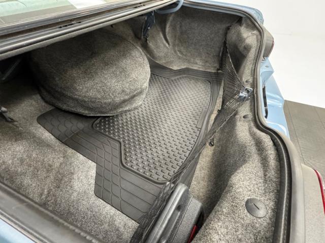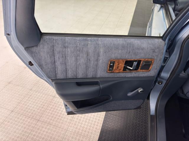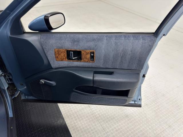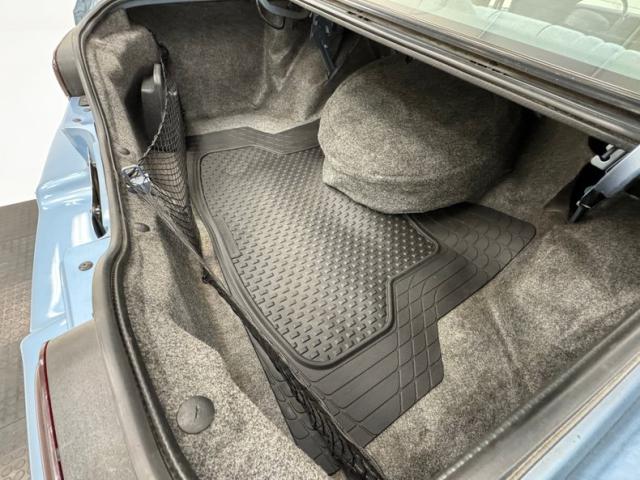 Early 90\'s glamour is encapsulated on the door panels where cloth inserts rise over blue vinyl and plastic, a carpeted side to the storage bin, and some simulated burlwood accenting on the hardware. All four doors are configured this way and in great shape, housing a crank window handle on each. The matching front seat is newer per our consignor and is a long bench with fold down armrest. Out back, the wide bench is the last of the great date night back seats, backed by a sizable package tray with inboard speakers and a third brake light. The clean blue steering wheel frames the horizontally oriented instrument cluster including the speedometer that sweeps to 100 mph in a burlwood faceplate that spans the entire dashboard. Idiot lights flank the speedometer while the typical Delco AM/FM/Cassette player and climate panel stack in the middle of the dash. Black carpet covers the floor and is new, the foam backed headliner above is in excellent shape, and the trunk is lined with gray panels and houses a protective fitted rubber mat.