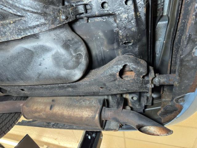 Surface rust is present underneath and some of it is flaking, but otherwise conditions are clean and dry. A single exhaust flows through a stock style muffler exiting just behind the bumper cover. Suspension is made up of coil springs up front and a 4 link with coil springs out back.