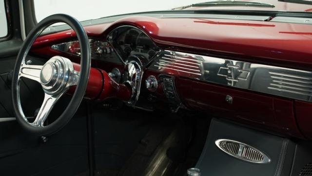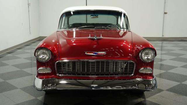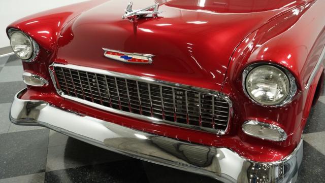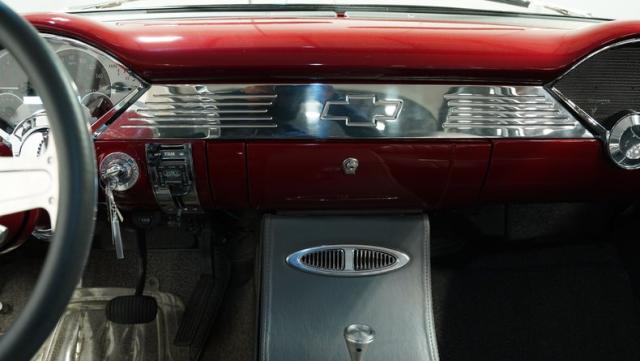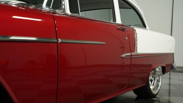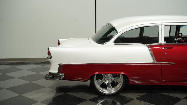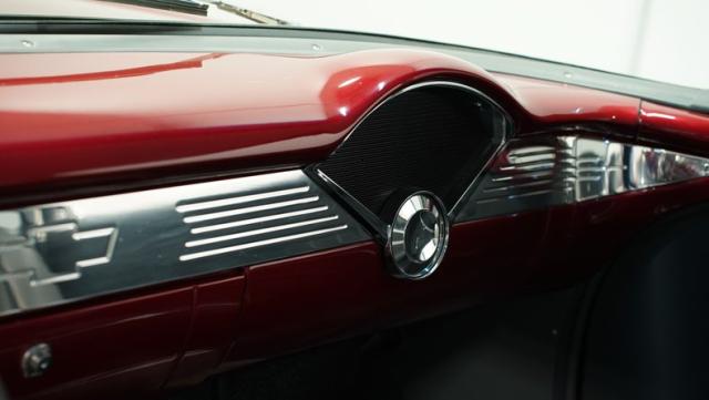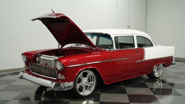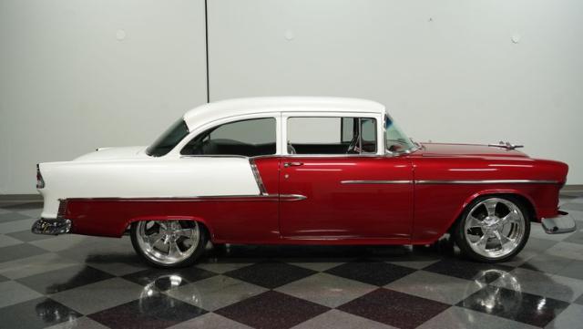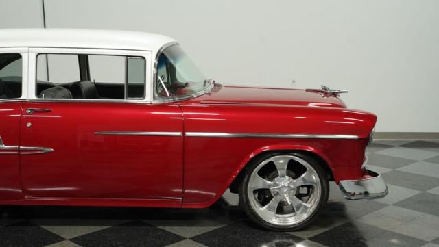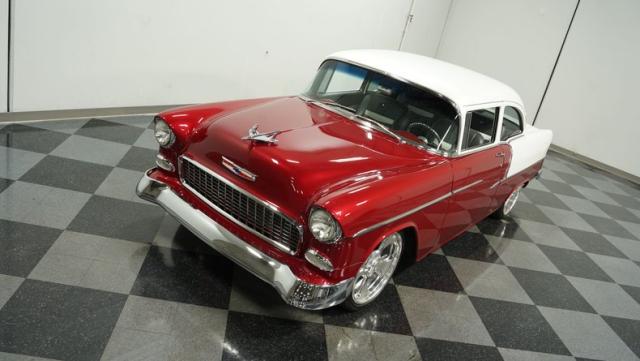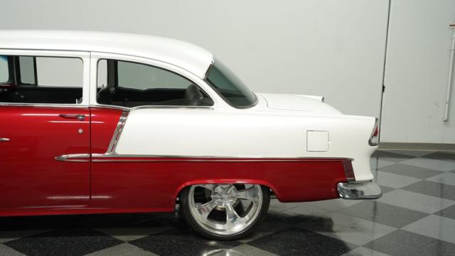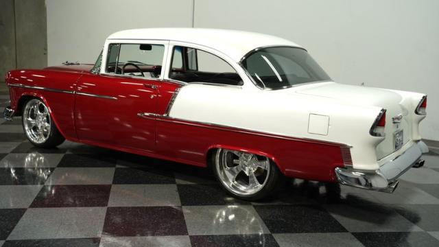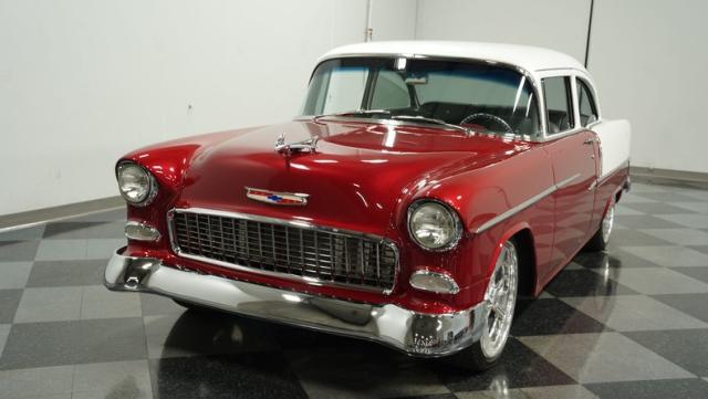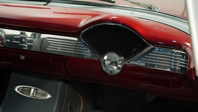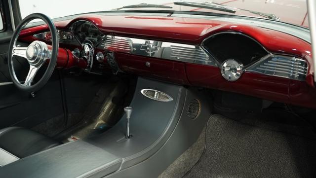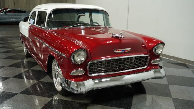 This 1955 Chevrolet 210 LS Restomod, classic American automotive design, now beefed up with a stance that demands respect. The deep burgundy hue meets the sophistication of white pearl, creating a visual spectacle. Rolling on 20\" Billet Specialties wheels shod in performance rubber, it features chrome bumpers and a grille that glint under the sun, complemented by stainless trim outlining its distinctive curves.