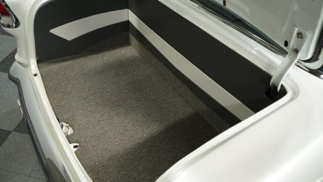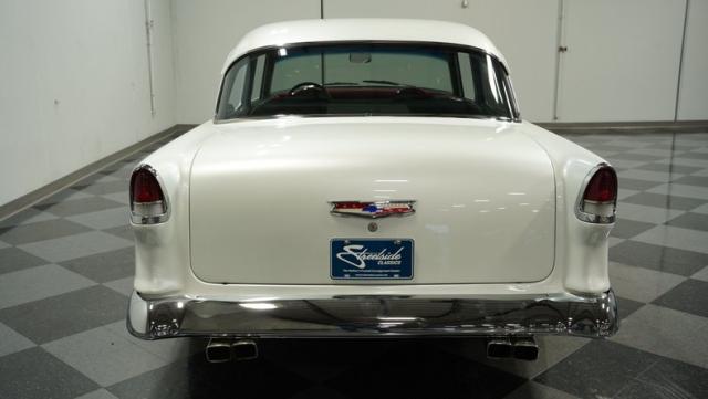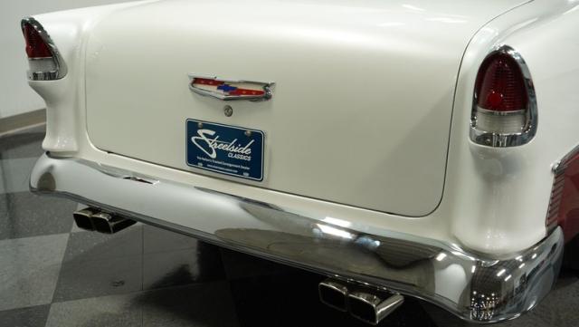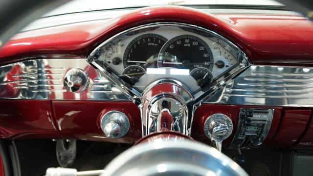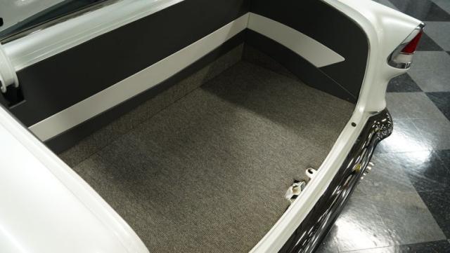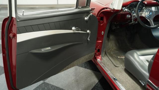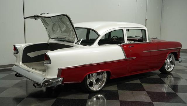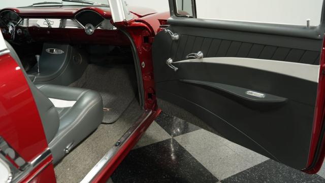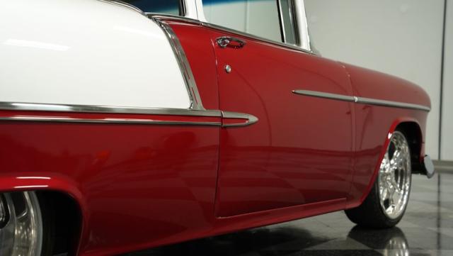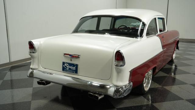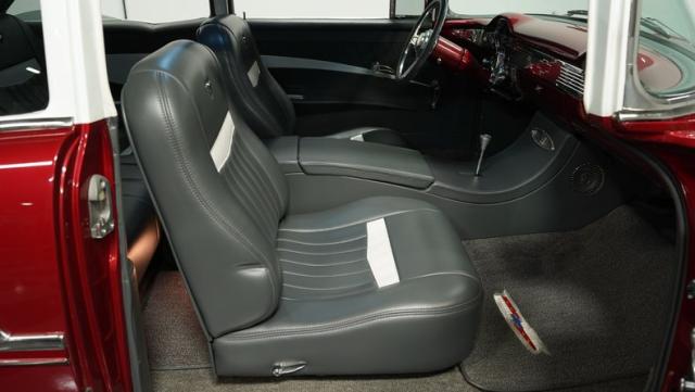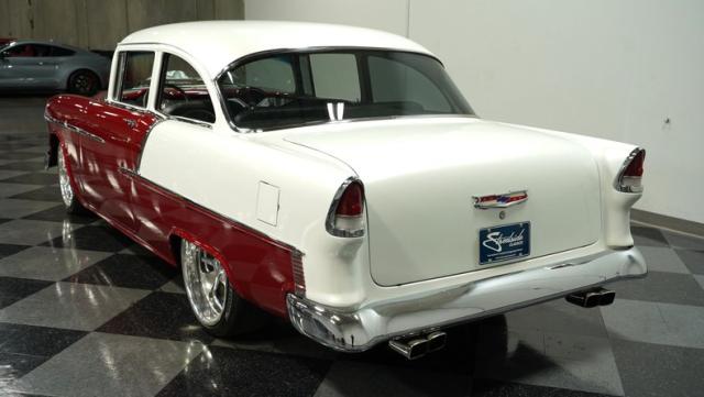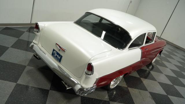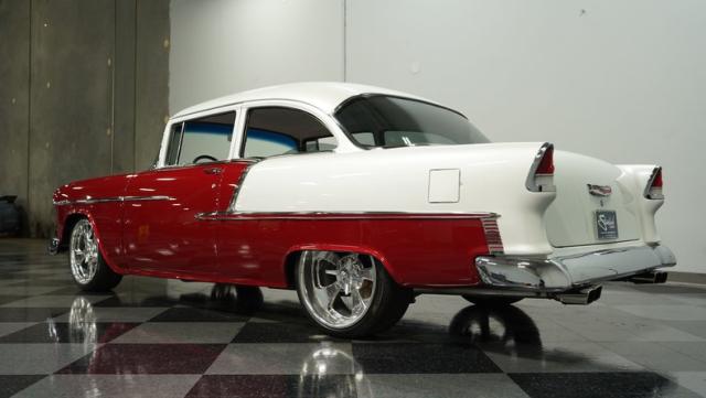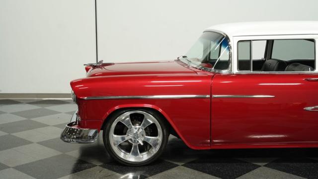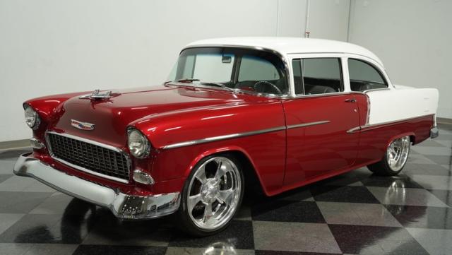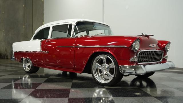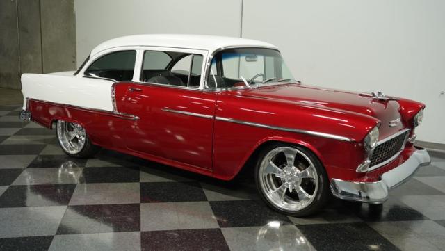 This 1955 Chevrolet 210 LS Restomod, classic American automotive design, now beefed up with a stance that demands respect. The deep burgundy hue meets the sophistication of white pearl, creating a visual spectacle. Rolling on 20\" Billet Specialties wheels shod in performance rubber, it features chrome bumpers and a grille that glint under the sun, complemented by stainless trim outlining its distinctive curves.