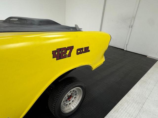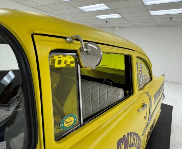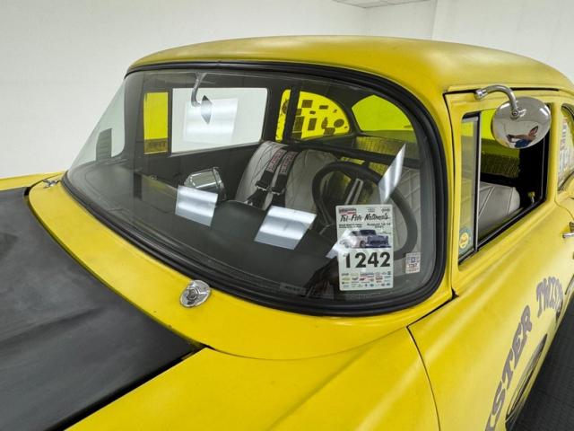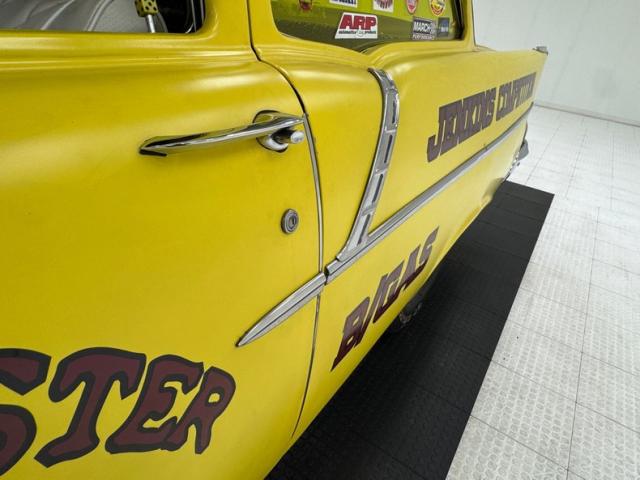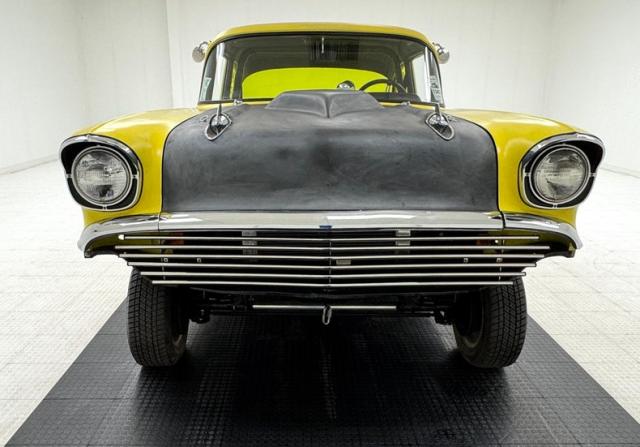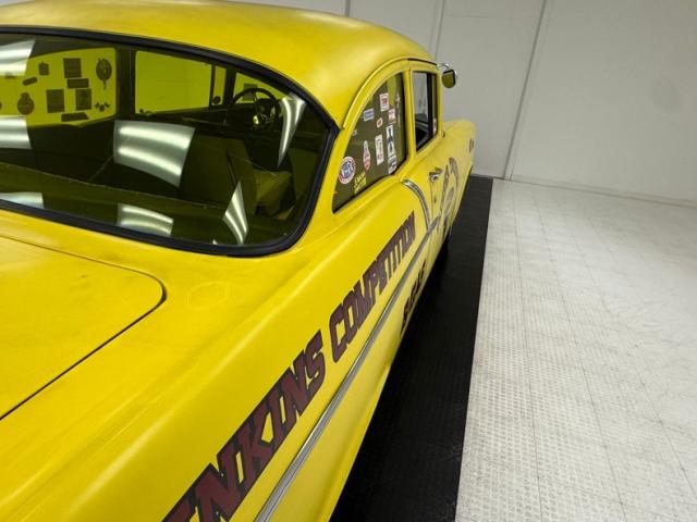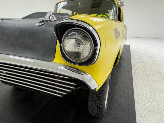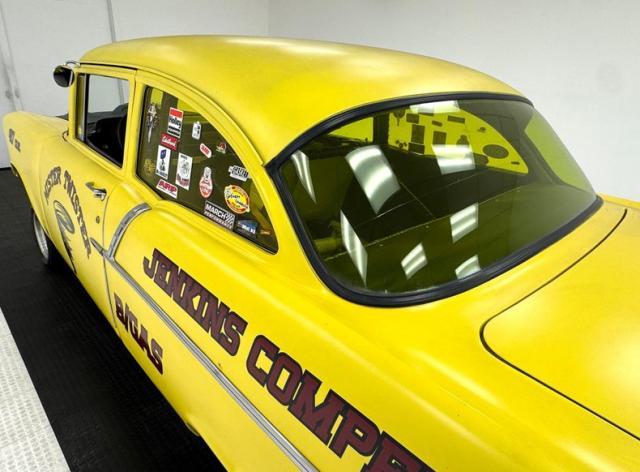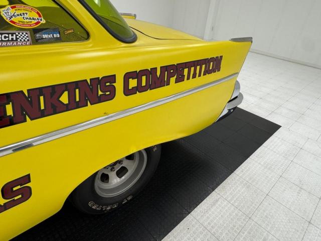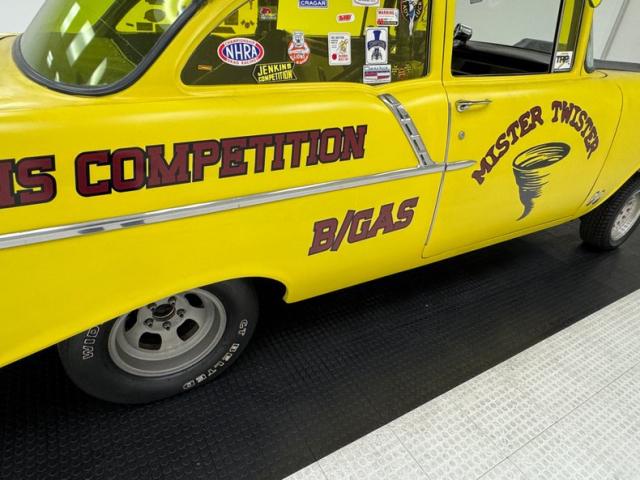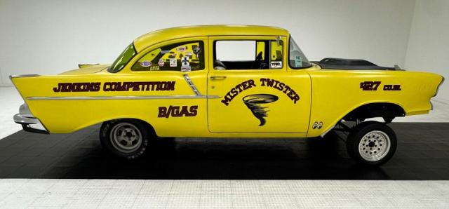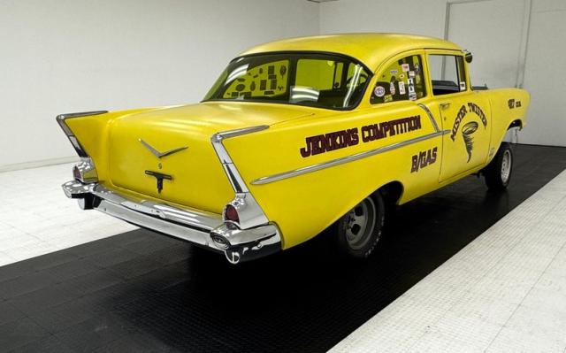 The beautiful lines of the 1957 Chevrolet form have been carefully maintained with the only difference being the jacked suspension and some chrome removed. This car is bathed in yellow with a few inclusions, paint runs, chips and cracks in the bodywork but keeps its chrome trimmings all around. The front bumper has been removed, (weight savings), and a tubular chrome grille replaces the original. Some racing monikers adorn the yellow tinted glass, moon eyes, a 427ci engine call out and Jenkins Competition paintwork have been added to the body. We have no paperwork to back up any claims of the car or drivetrain having any ties to Jenkins Competition or Grumpy himself. Up front rocket trimming adorn the satin black painted fiberglass teardrop hood and on back a simple gold V adorns the trunk while a bright and shiny chrome bumper hangs below and melds with the tail lights to dress up the rear and tops of the fins. Within the front wheel wells are snarling white header pipes which form into a single cut off pipe that when the engine is fired up will absolutely \"rack off\". 14-inch Centerline aluminum wheels are on the front and in the back are a pair of Ansen aluminum slots in more 14\" format.