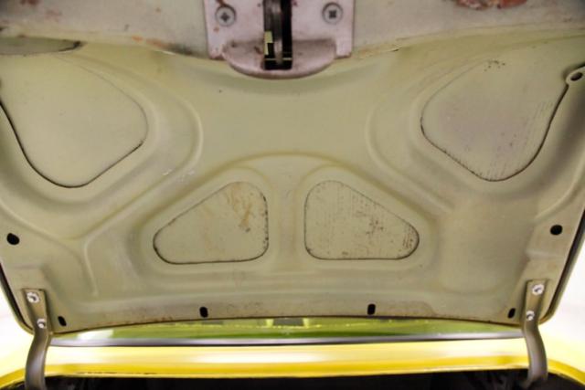 Smooth black vinyl vies for spaces against ribbed vinyl, also in black, for the panels which are screwed to the doors and house the shiny handles and knobs and a black armrest pull. Slipping inside, white diamond pleated tuck and roll vinyl with white piping and smooth bolters covers the front bucket seats which are courtesy of a 1965 Pontiac GTO. The rear seats have been removed to make way for the added roll bar and shiny silver matting covers the void. A corroded chrome armed shifter is seen between the buckets. The dash has become more square in its design but still has deep round black painted metal bezels for the gauges. Streaking through the middle of the dash is a shiny mesh aluminum trim which breaks up all the black painted metal and a chrome dash top mounted tachometer is staring at the pilot. Below the dash is a chrome panel with a duo of aftermarket gauges. A black sagging headliner is above, and below is a sea of black nice carpeting.