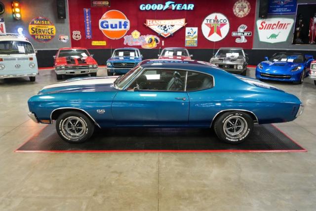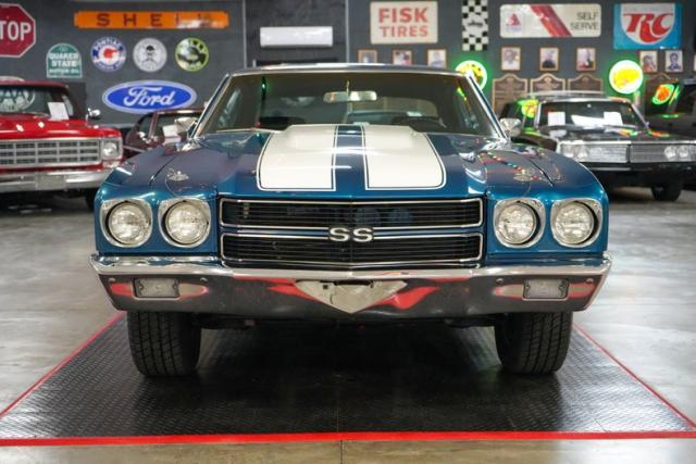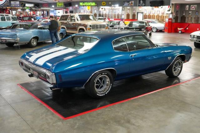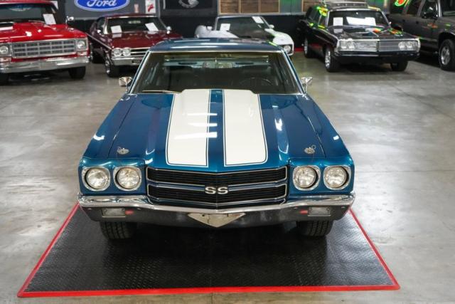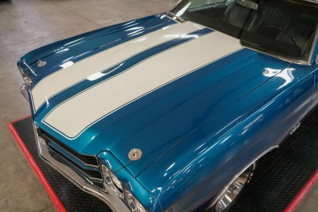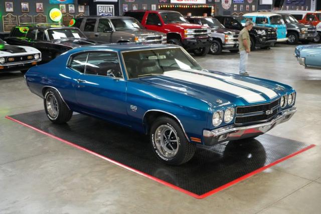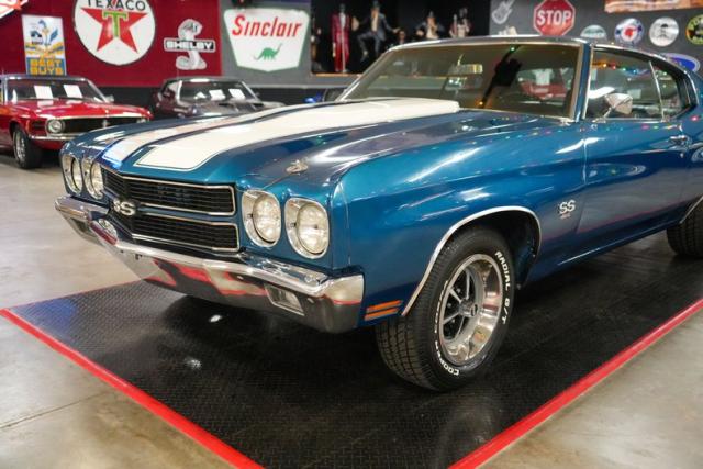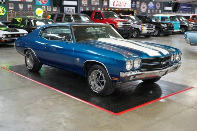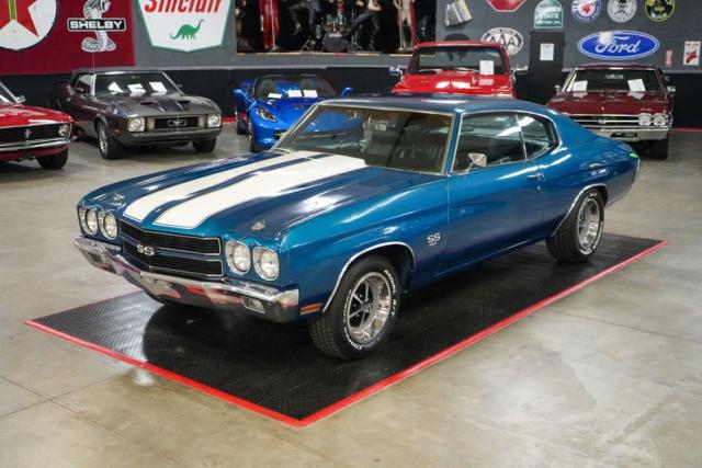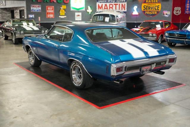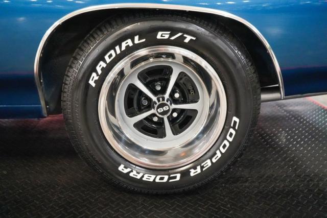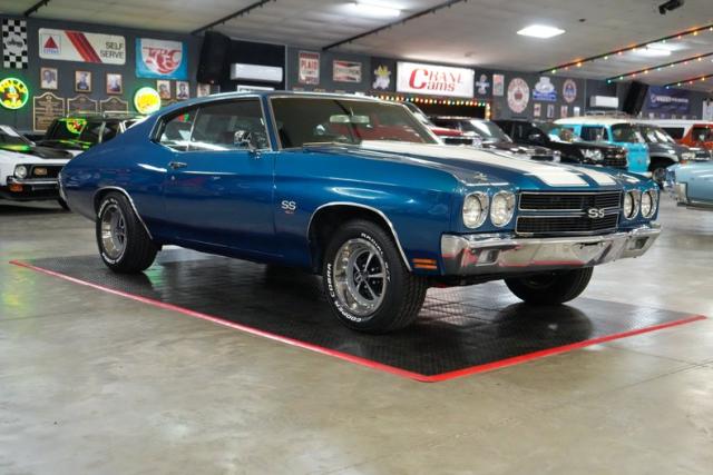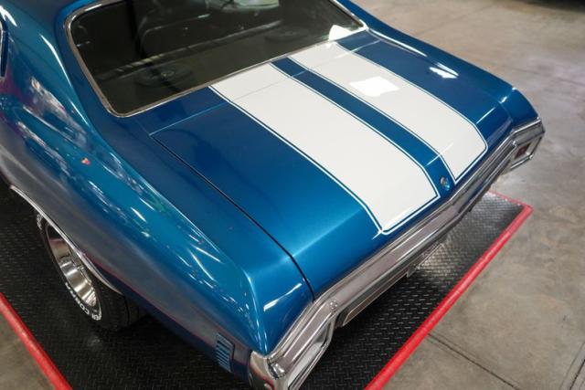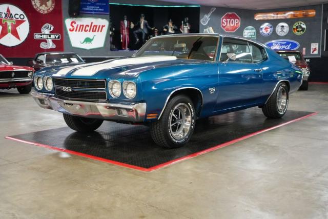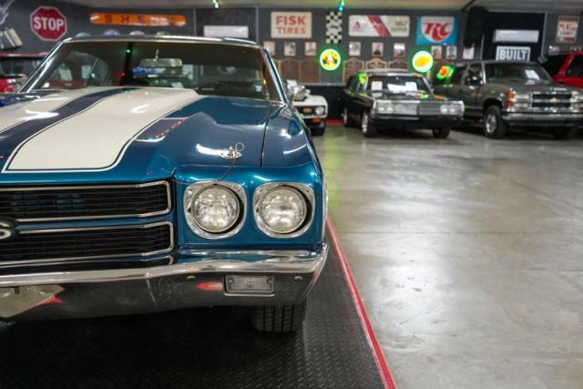 This 1970 Chevrolet Chevelle is a bold big-block street machine powered by a 454 Big Block Chevy V8 paired with a TH350 automatic transmission and 12-bolt rear end with 3.55 gears. It features power steering, power brakes, and upgraded Wilwood 4-wheel disc brakes for confident stopping. The black vinyl interior pairs perfectly with the blue exterior paint and white stripes. It rides on 15\" GM Magnum 500 wheels with Cooper Cobra tires. Performance parts include an Edelbrock Performer 2.0 intake, Holley carb, MSD ignition system, aluminum radiator, dual electric fans, headers, Pypes mufflers, and rear adjustable coil-overs. THIS VEHICLE QUALIFIES FOR FREE SHIPPING AND A WARRANTY!!