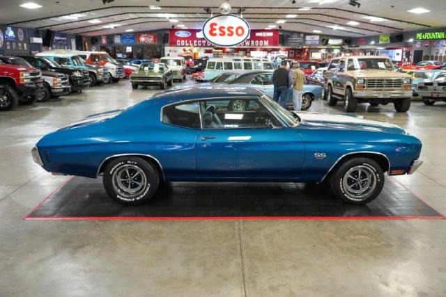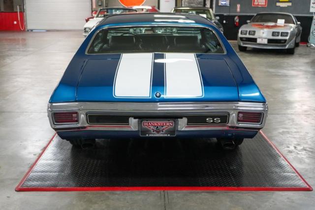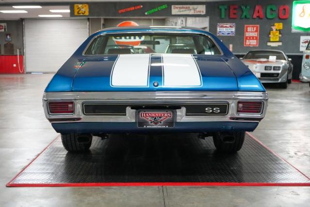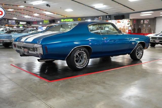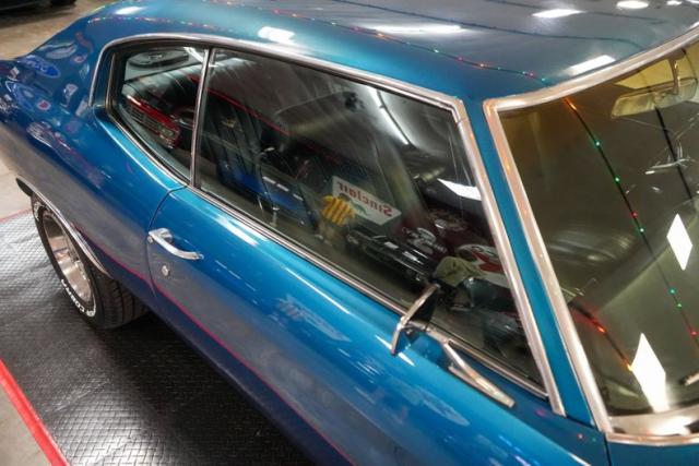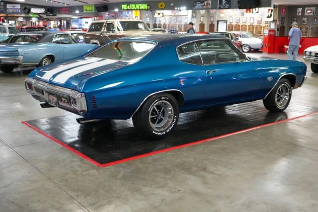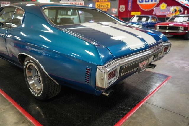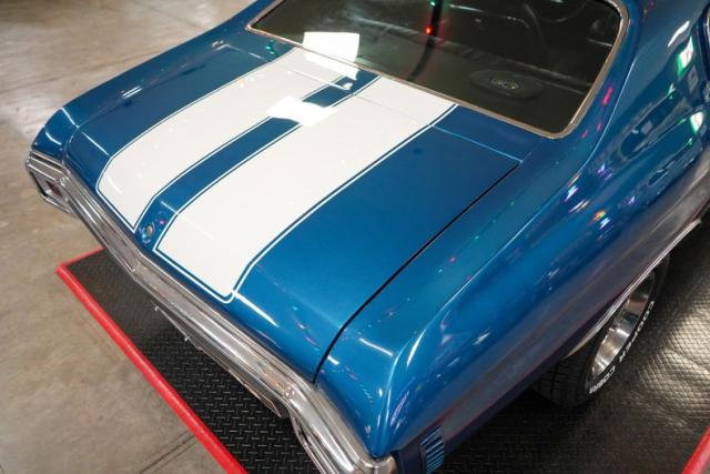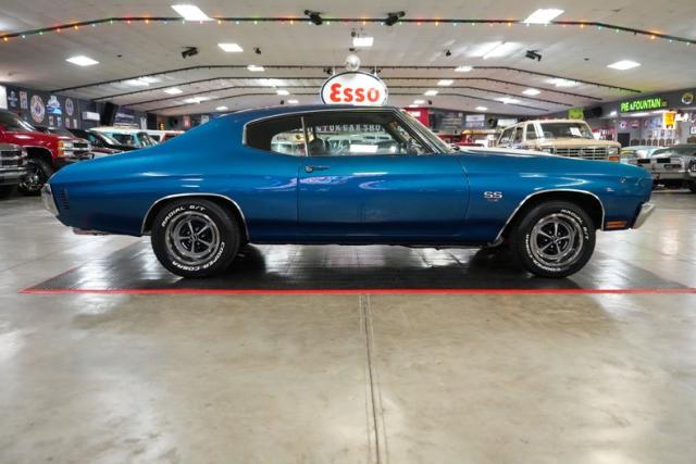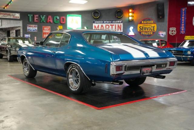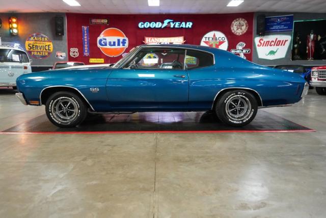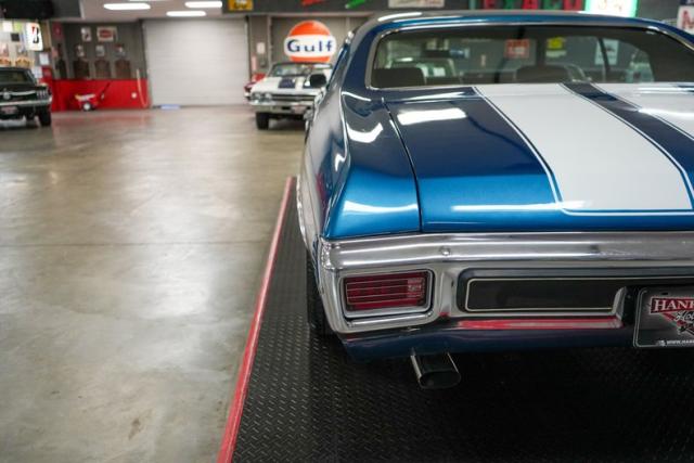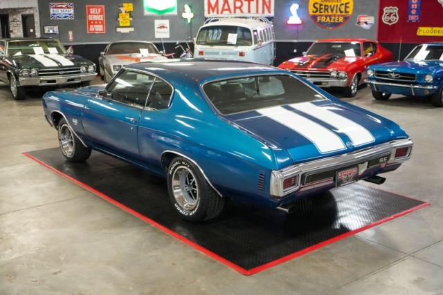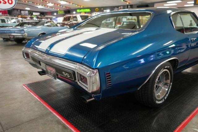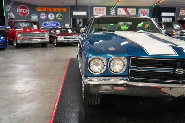 This 1970 Chevrolet Chevelle is a bold big-block street machine powered by a 454 Big Block Chevy V8 paired with a TH350 automatic transmission and 12-bolt rear end with 3.55 gears. It features power steering, power brakes, and upgraded Wilwood 4-wheel disc brakes for confident stopping. The black vinyl interior pairs perfectly with the blue exterior paint and white stripes. It rides on 15\" GM Magnum 500 wheels with Cooper Cobra tires. Performance parts include an Edelbrock Performer 2.0 intake, Holley carb, MSD ignition system, aluminum radiator, dual electric fans, headers, Pypes mufflers, and rear adjustable coil-overs. THIS VEHICLE QUALIFIES FOR FREE SHIPPING AND A WARRANTY!!