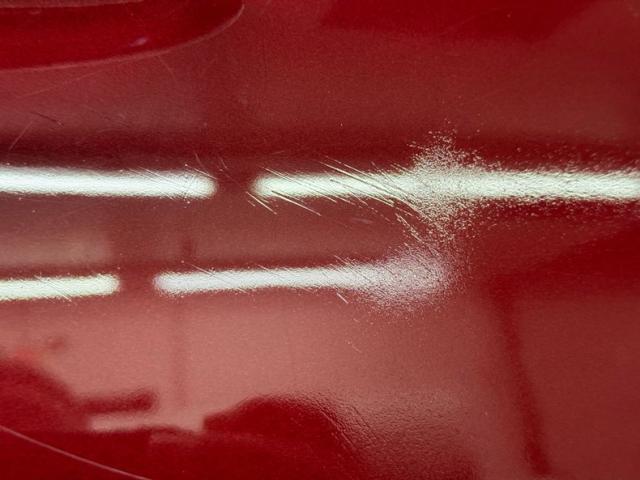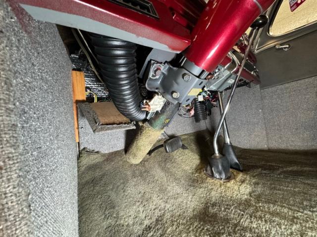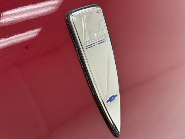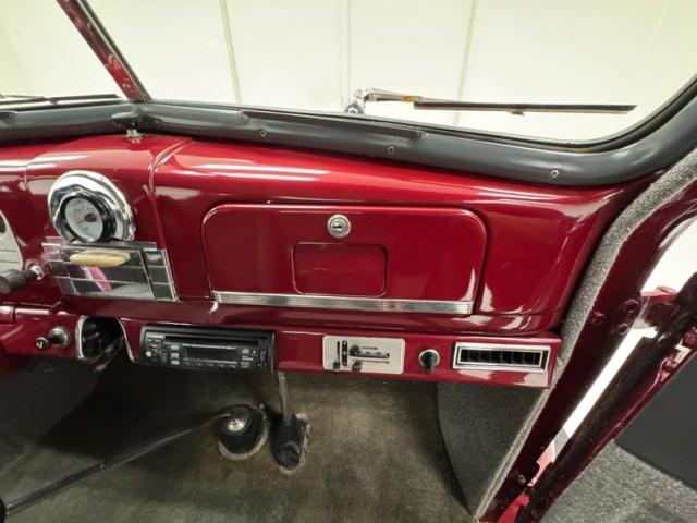 The tall Master Deluxe comes at you with a flat straked chrome grille that is perfectly integrated to the body lines, underscored by a slightly curved chrome bumper, and punctuated by chrome light rings around the bullet cased headlights. Let\'s not forget the piercing hood ornament which resembles Ultraman at speed, and fronts a long hood line that\'s adorned with side vents that are as attractive as they are functional. A humpback trunk adds more length to the car, here in two stage Ruby Red Metallic, and is flanked by protruding tail lights over another chrome bumper and impressive chrome exhaust tips. Chrome Nugget wheels stand this car up with 14-inchers in front and 15-inchers in back, wrapped in staggered size tires and visually connected by the black running board. The paint has multiple imperfections including a spill stain trailing from the gas cap and significant cracking throughout. Some of the metalwork, including the grille, would benefit from restoration.